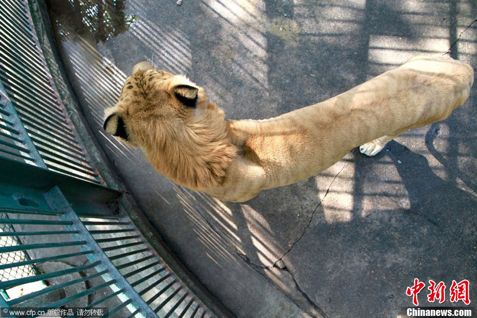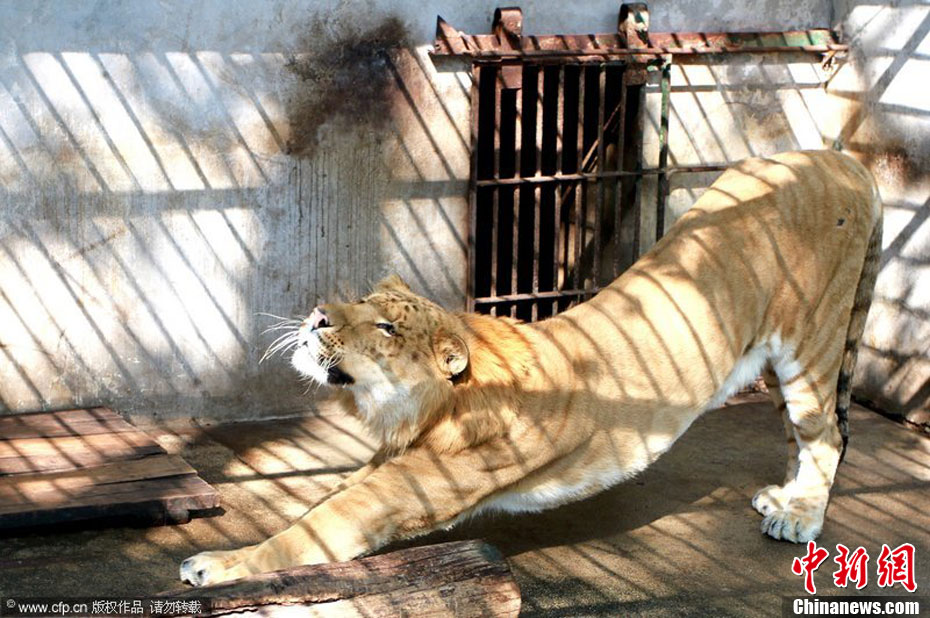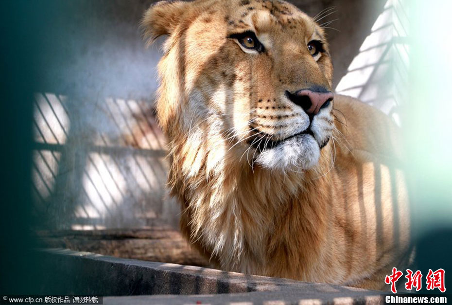 2010年10月27日,江西九江甘棠公園動物園工作人員正隔著鐵欄桿在給一只虎頭獅身的“怪物”撓癢。這只“怪物”名叫獅虎獸,是是雄性獅子和雌性老虎交配產(chǎn)生的后代。此只獅虎獸引進自安徽安慶,目前已三歲,這是獅虎獸首次亮相江西,有關(guān)資料顯示,獅虎獸的成活率只有50萬分之一,目前世界上存活的獅虎獸只有20只左右,所以被形容為比熊貓還珍貴的動物。 圖片來源:CFP視覺中國