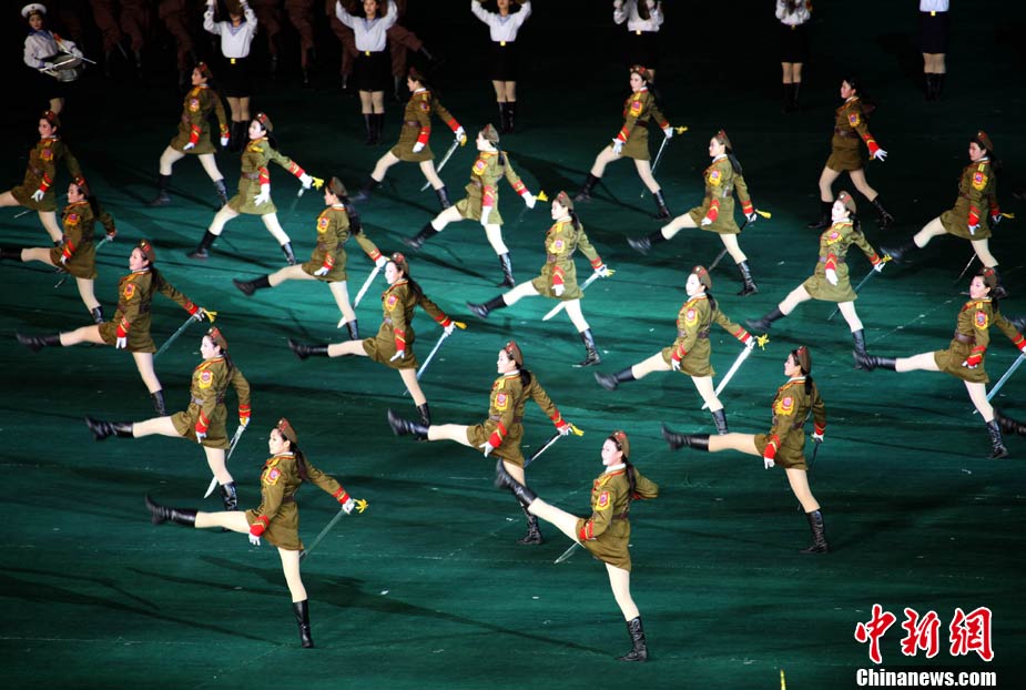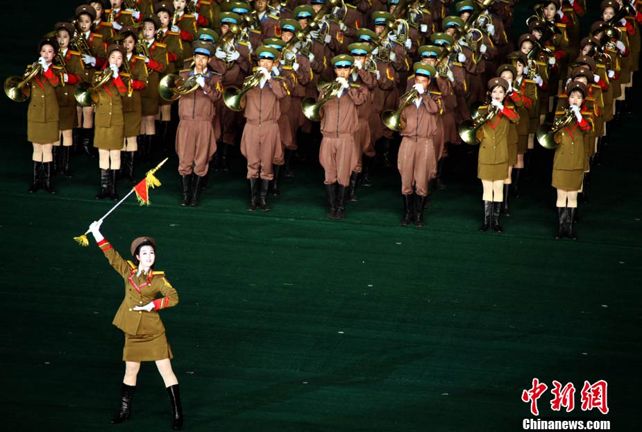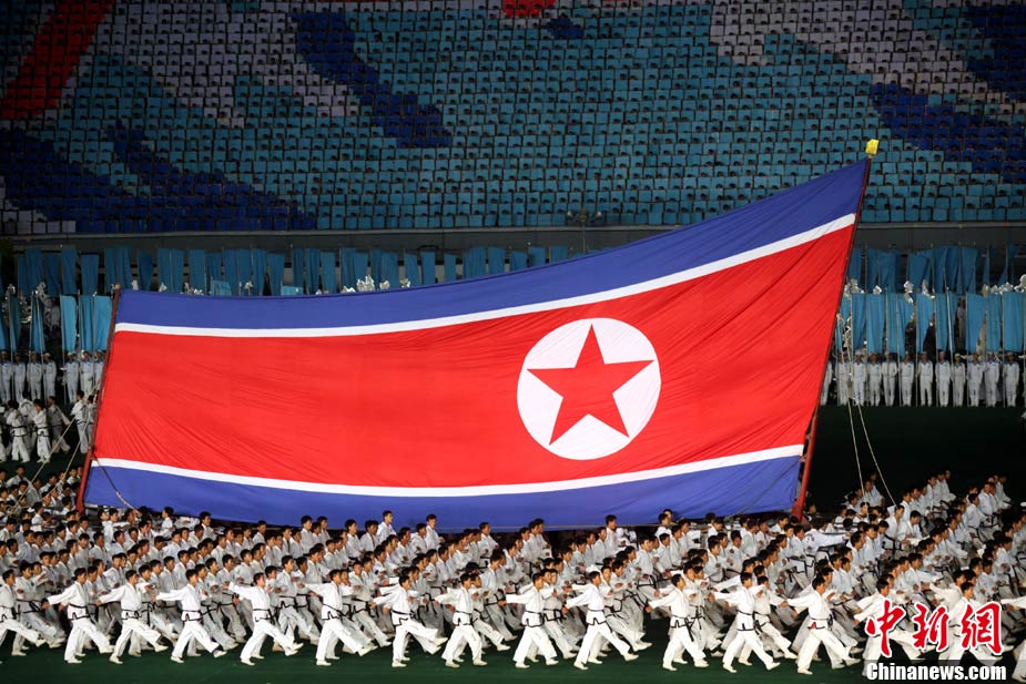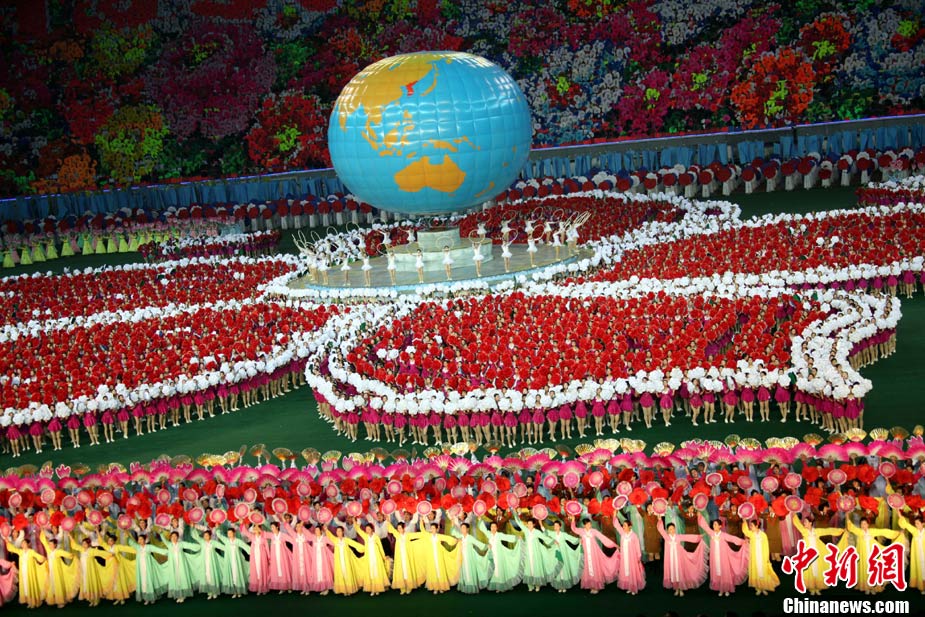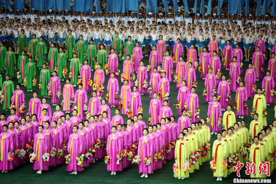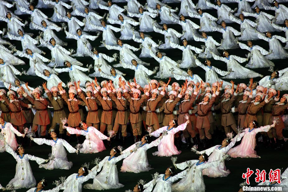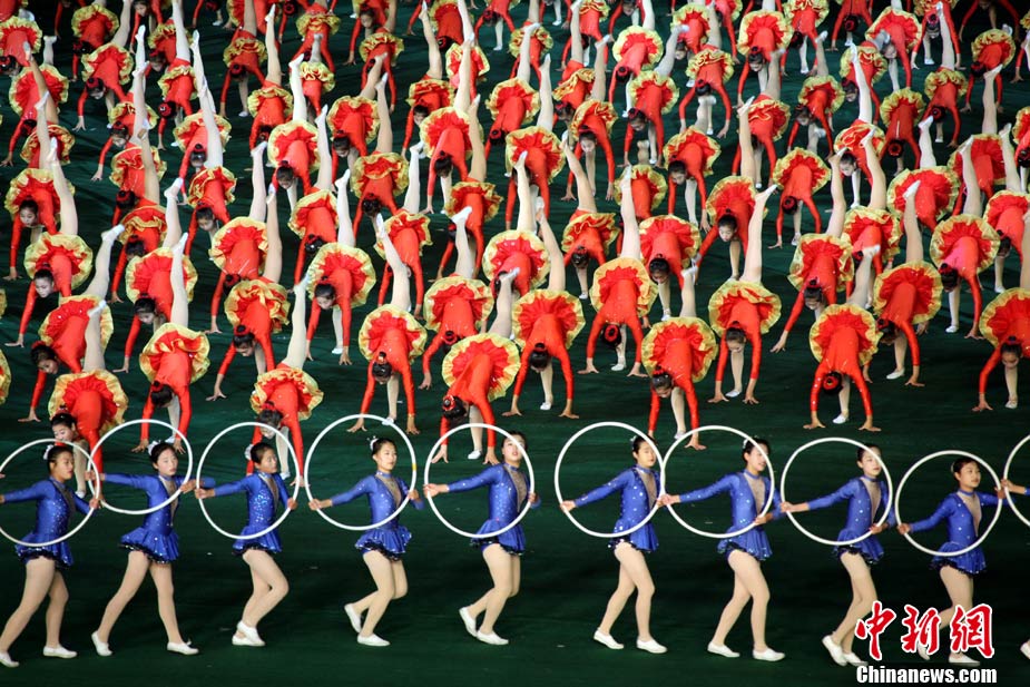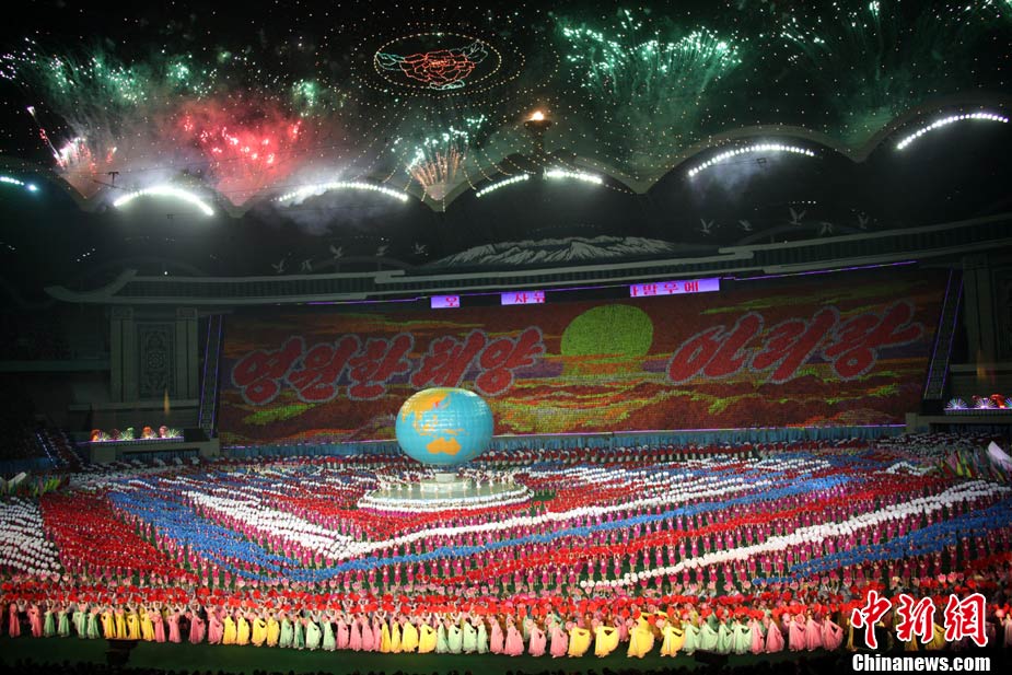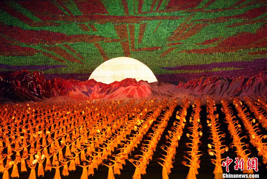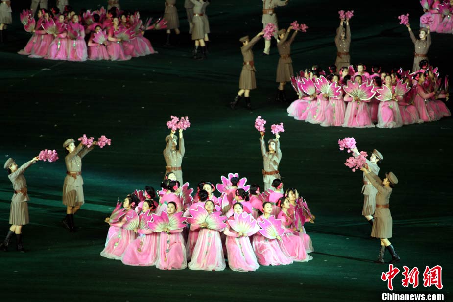 10月23日,朝鮮在平壤“五一”體育場(chǎng)為紀(jì)念中國(guó)人民志愿軍入朝參戰(zhàn)60周年舉辦大型團(tuán)體操和藝術(shù)表演《阿里郎》。 中新社記者 孫自法 攝