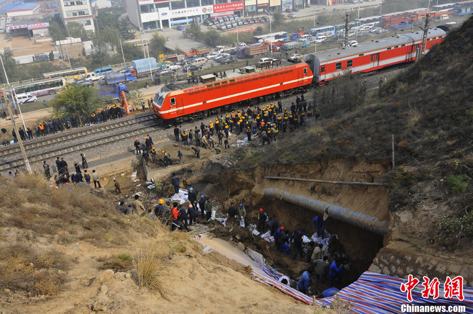 10月30日早晨,蘭新鐵路線遭水害遇險(xiǎn)情,蘭新線K8+500米處南側(cè)山上,有廢水從山體沖下,將蘭新線上下行路基沖穿,嚴(yán)重危及行車安全。根據(jù)鐵路部門的測(cè)量,上行路基一側(cè)被沖塌形成了50立方米的坑,下行路基一側(cè)沖塌形成的坑有24立方米。蘭州鐵路局等組織7臺(tái)大型機(jī)械,共有700多人投入搶險(xiǎn)。經(jīng)全力奮戰(zhàn),11時(shí)整,蘭新線下行線路開通;11時(shí)15分,蘭新線上行線路開通。楊艷敏 攝