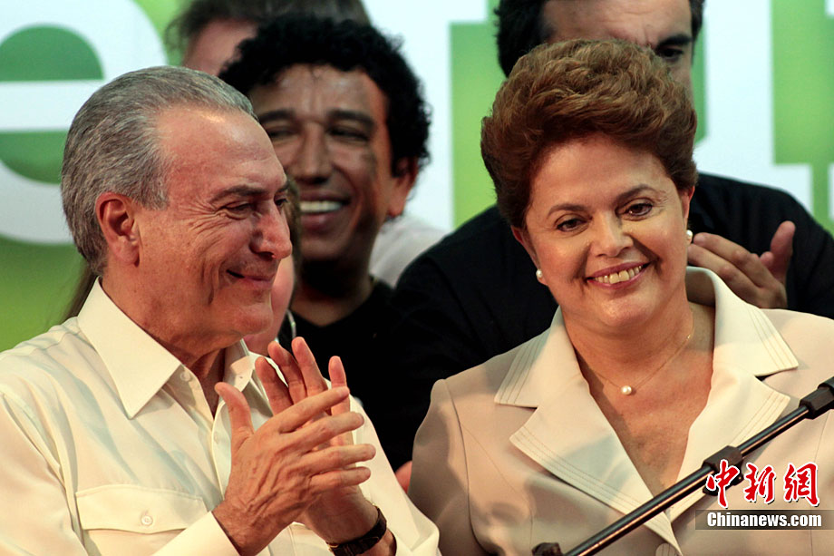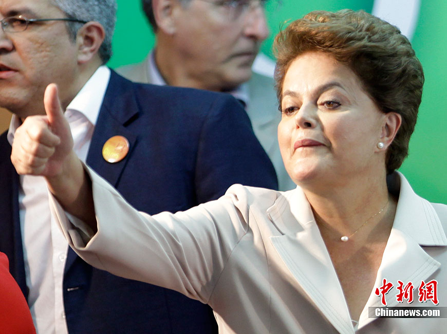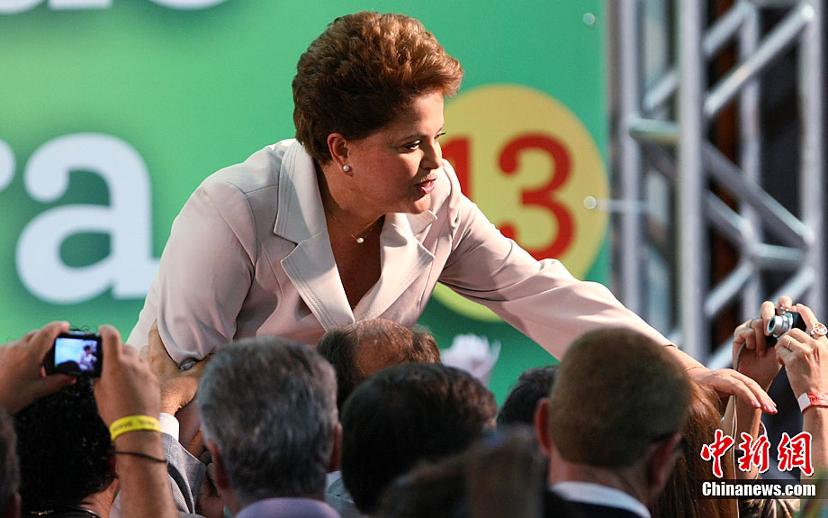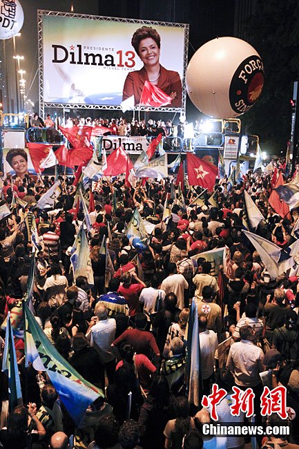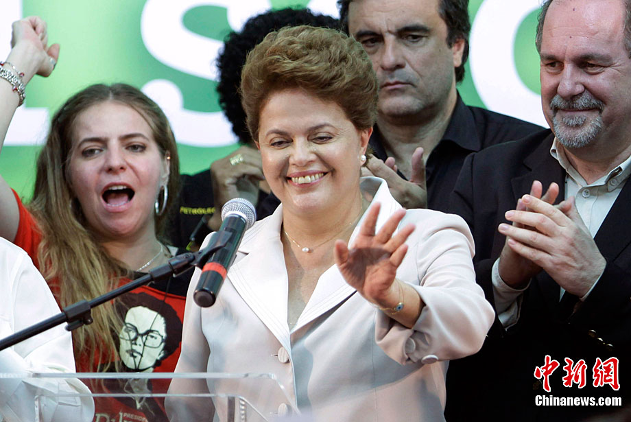 巴西當(dāng)?shù)貢r間10月31日選出該國首位女總統(tǒng),當(dāng)天巴西最高選舉法院宣布,根據(jù)已統(tǒng)計完的95%的選票,勞工黨候選人迪爾瑪·羅塞夫在第二輪投票中勝出,當(dāng)選總統(tǒng),F(xiàn)年62歲的羅塞夫獲得55%的選票,擊敗了唯一的競爭對手前圣保羅州州長、社會民主黨候選人若澤·塞拉。圖為10月31日,勞工黨候選人迪爾瑪·羅塞夫在巴西利亞舉辦獲勝演說。