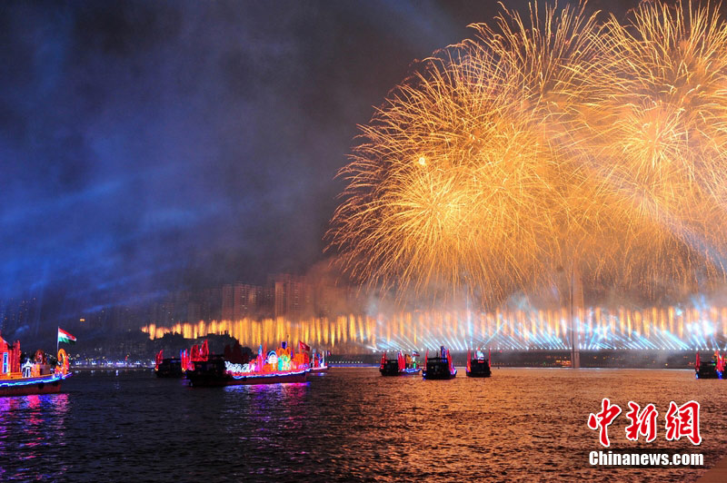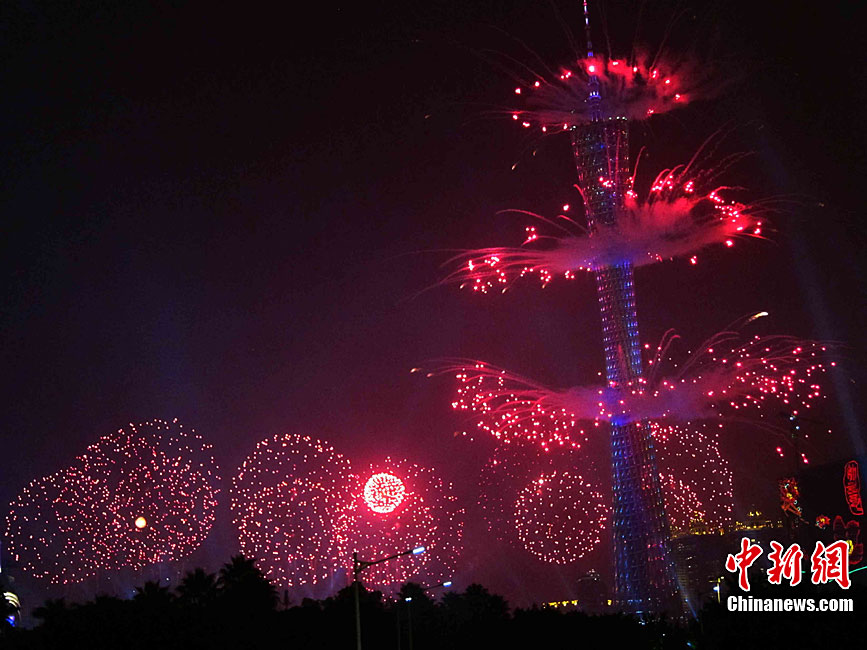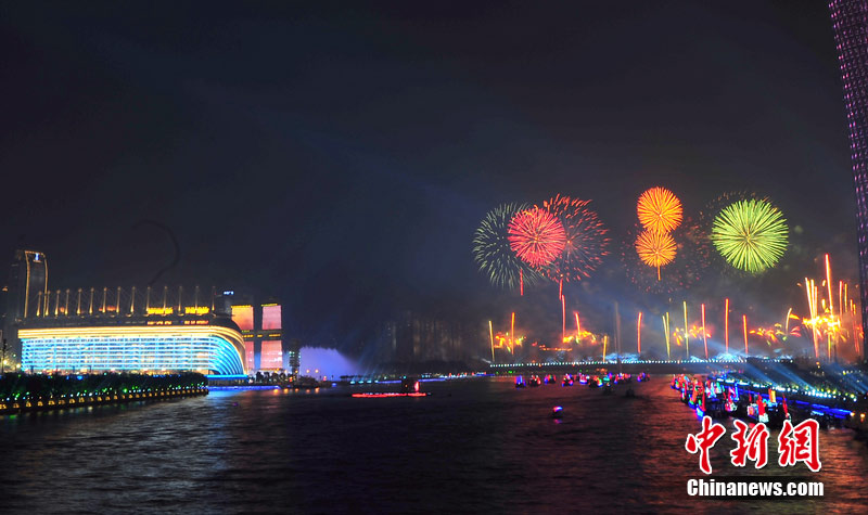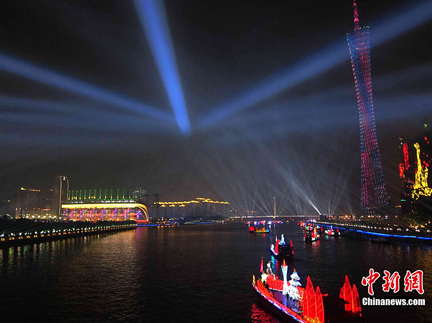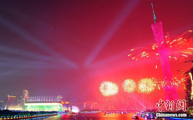2010年11月3日晚,廣州海心沙上演包括煙花預(yù)演在內(nèi)的亞運(yùn)開幕式帶妝彩排。圖片來源:CFP視覺中國