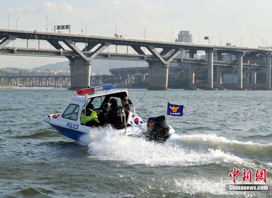 當?shù)貢r間11月3日,韓國首爾附近的漢江中韓國水警舉行了針對G20峰會安保工作的演練。