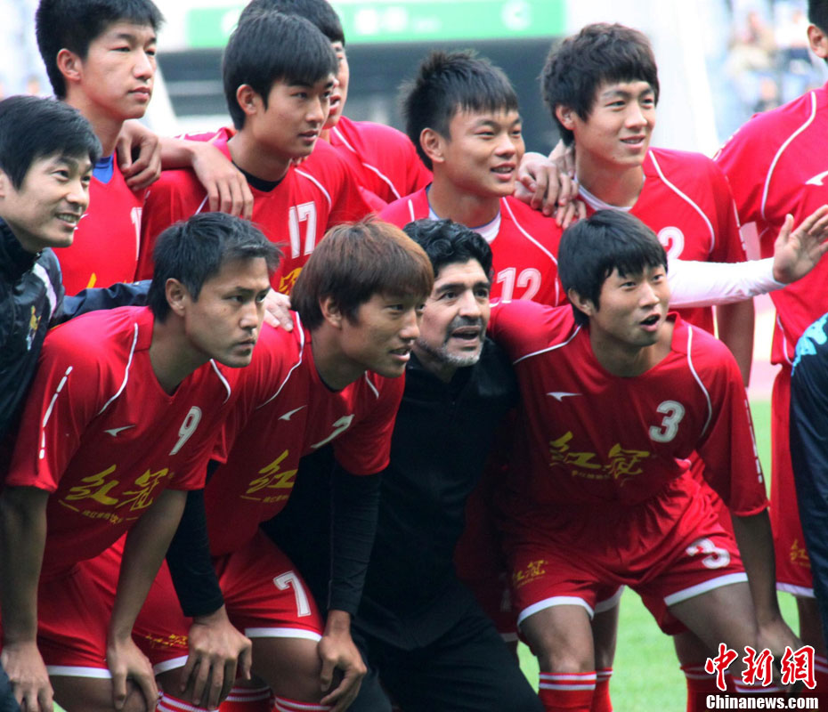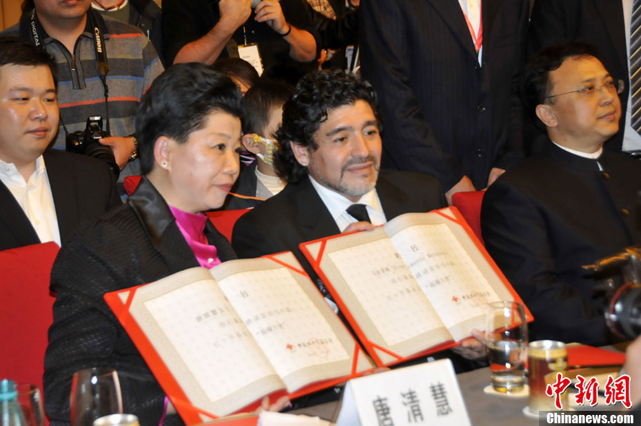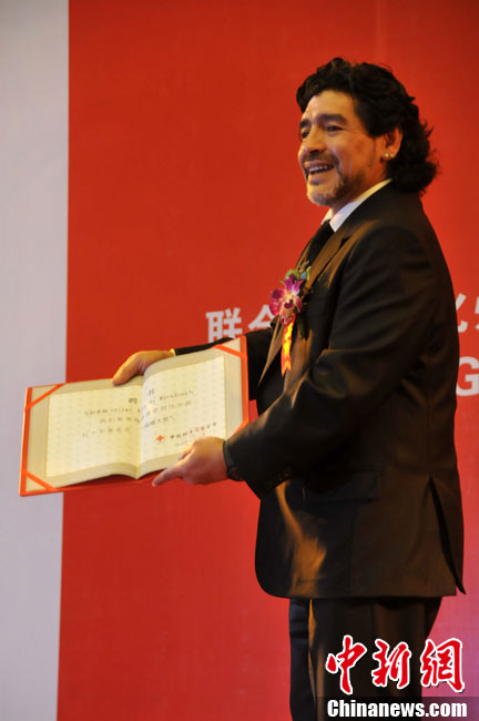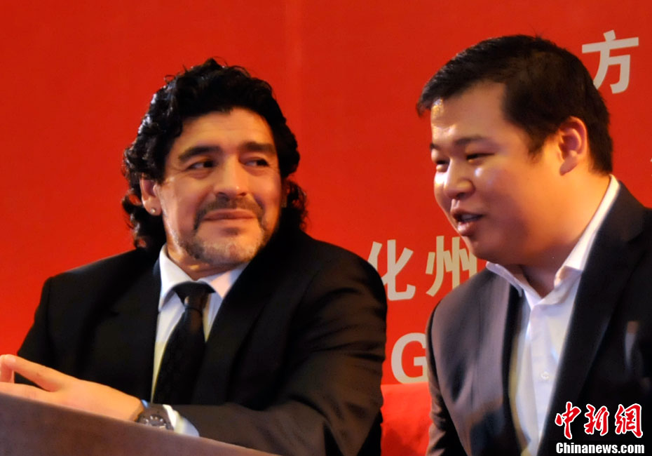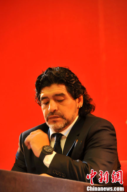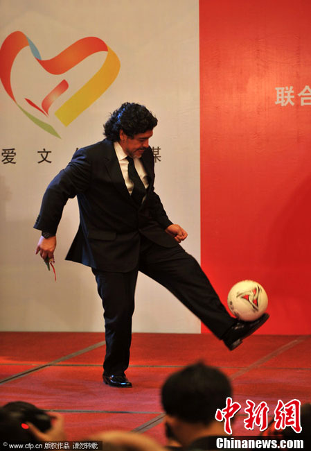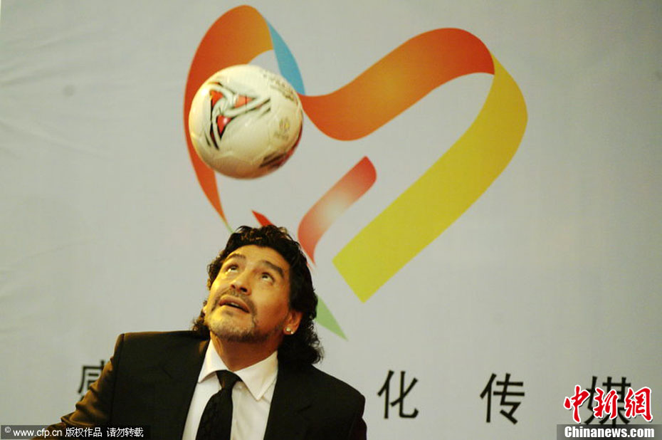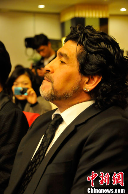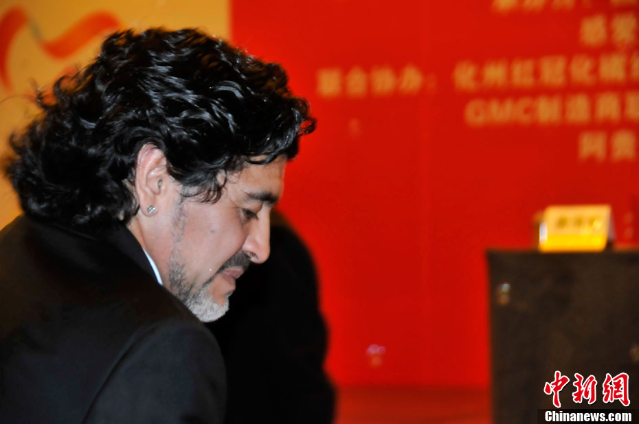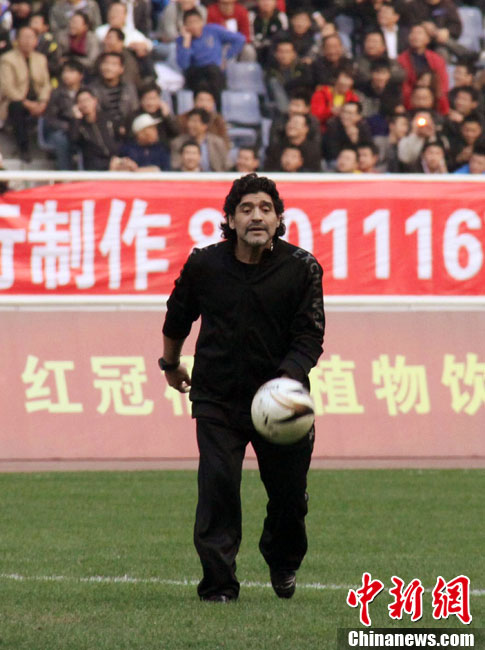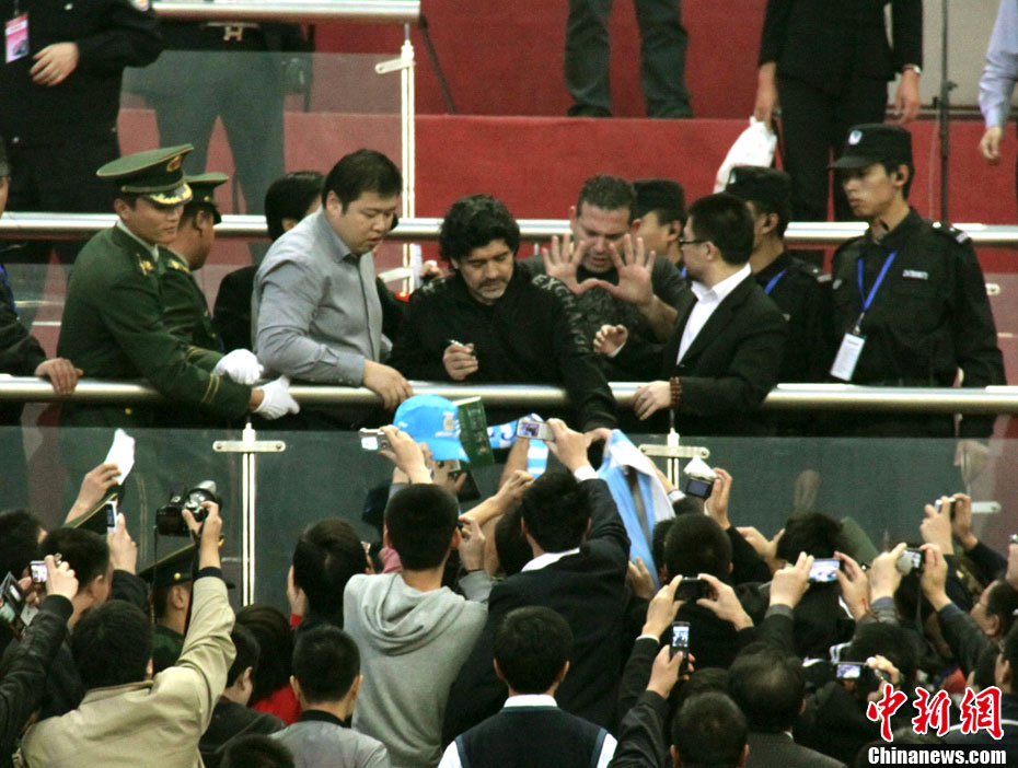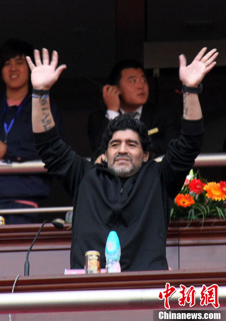 11月5日下午16時左右,世界球王馬拉多納來到山東濟(jì)南奧體中心參加山東聯(lián)隊(duì)與阿根廷明星隊(duì)的慈善比賽。圖為馬拉多納向現(xiàn)場的觀眾和球迷揮手致意。中新社發(fā) 牛杰峰 攝
