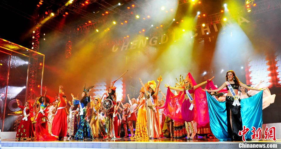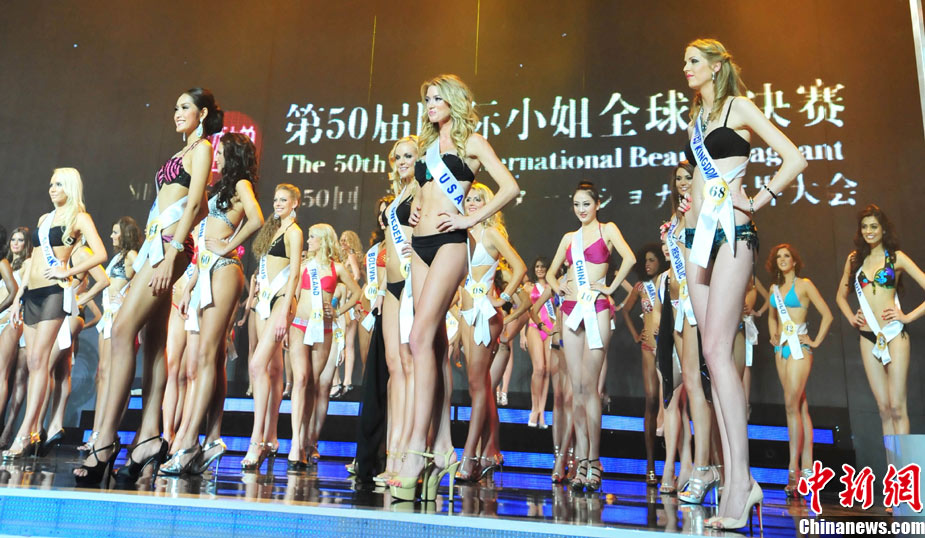11月7日晚,第50屆國(guó)際小姐世界大會(huì)全球總決賽在成都拉開帷幕。來自全球70個(gè)國(guó)家和地區(qū)的70名佳麗經(jīng)過激烈角逐,最終委內(nèi)瑞拉小姐Elizabeth Mosquera摘得桂冠,泰國(guó)小姐Piyaporn Deejing、中國(guó)小姐袁思怡分獲亞軍和季軍。圖為各國(guó)佳麗的進(jìn)行泳裝展示。中新社發(fā) 安源 攝
