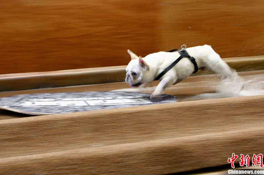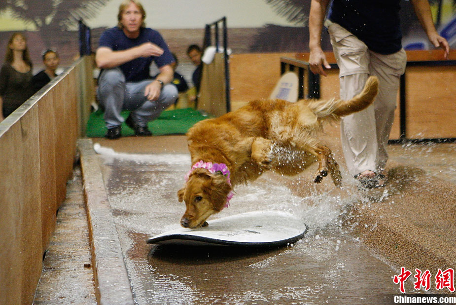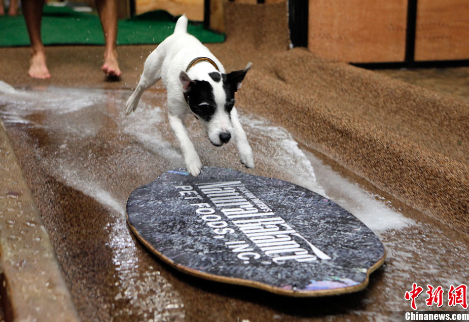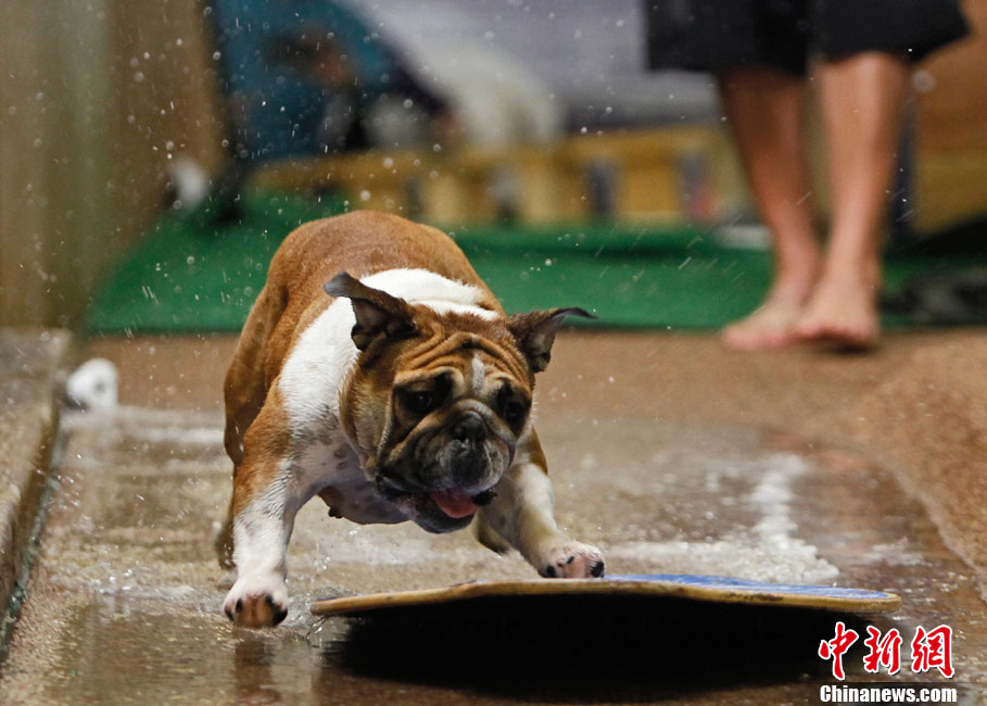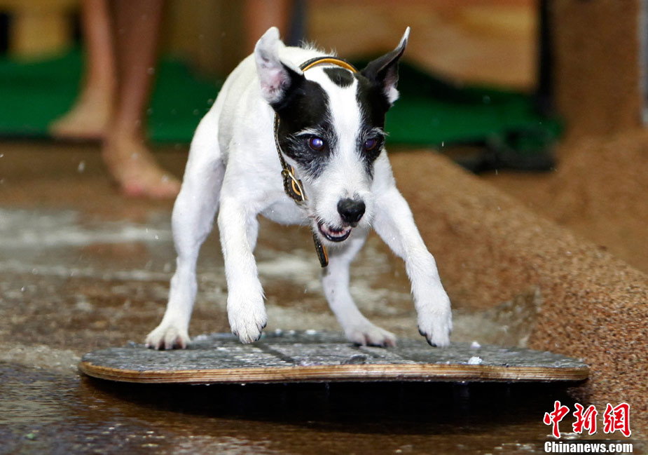 11月8日,在美國洛杉磯舉行了一場(chǎng)別開生面的狗狗滑水大賽,參賽的可愛狗狗們?cè)凇百惖馈鄙险宫F(xiàn)滑水“絕技”。