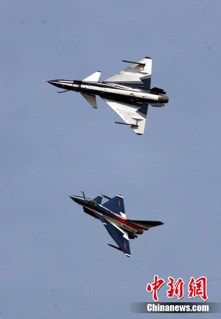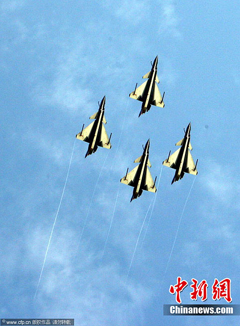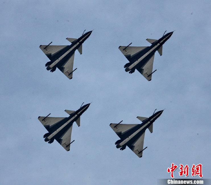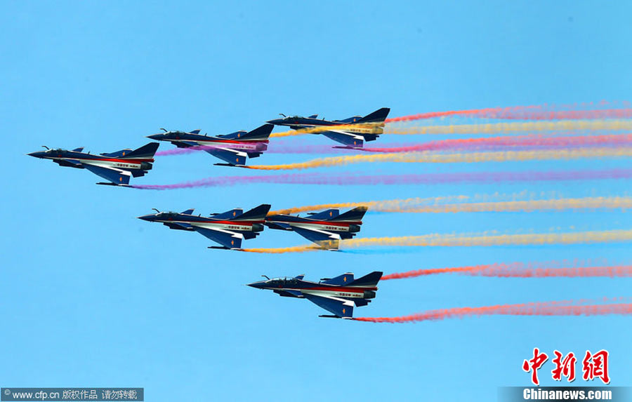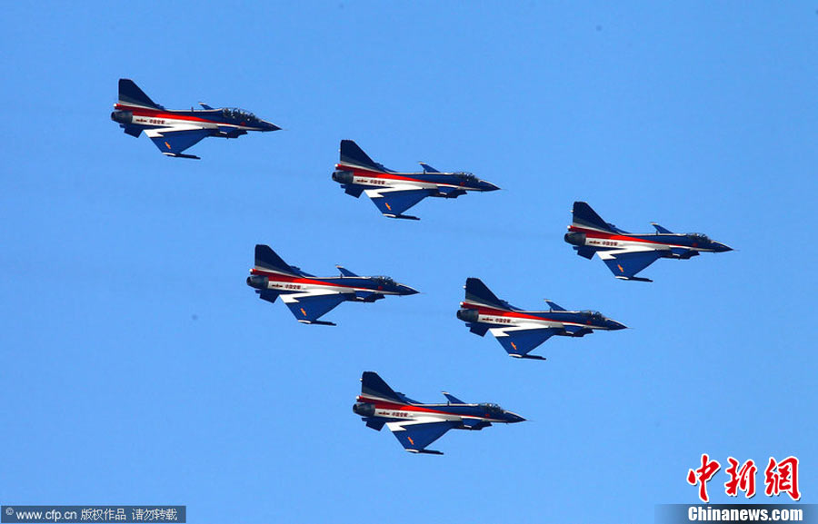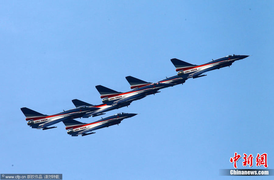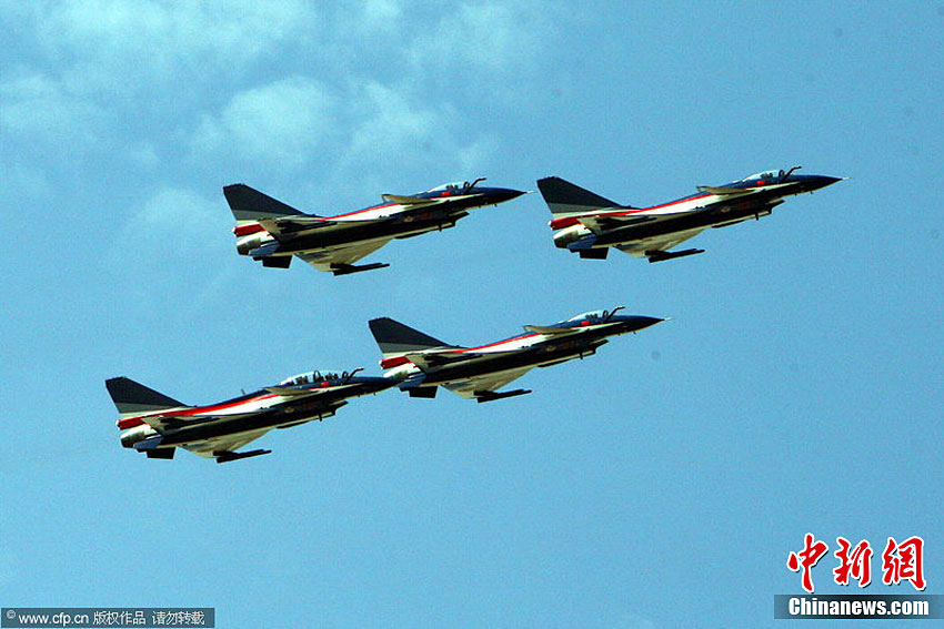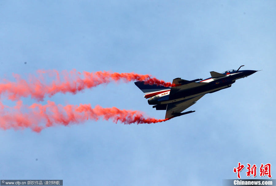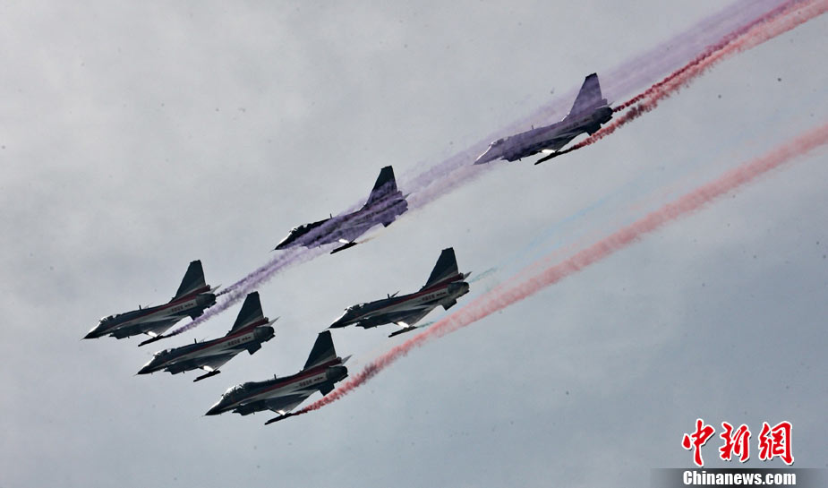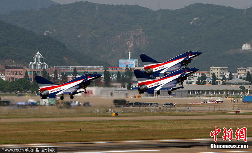 11月10日上午10點(diǎn)32分,隨著3架八一飛行表演隊(duì)的殲-10戰(zhàn)機(jī)起飛升空,八一飛行表演隊(duì)開始了在珠海的首次飛行訓(xùn)練。圖為三機(jī)編隊(duì)特技演練。圖片來源:CFP視覺中國 趙梓 攝