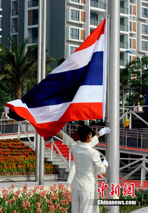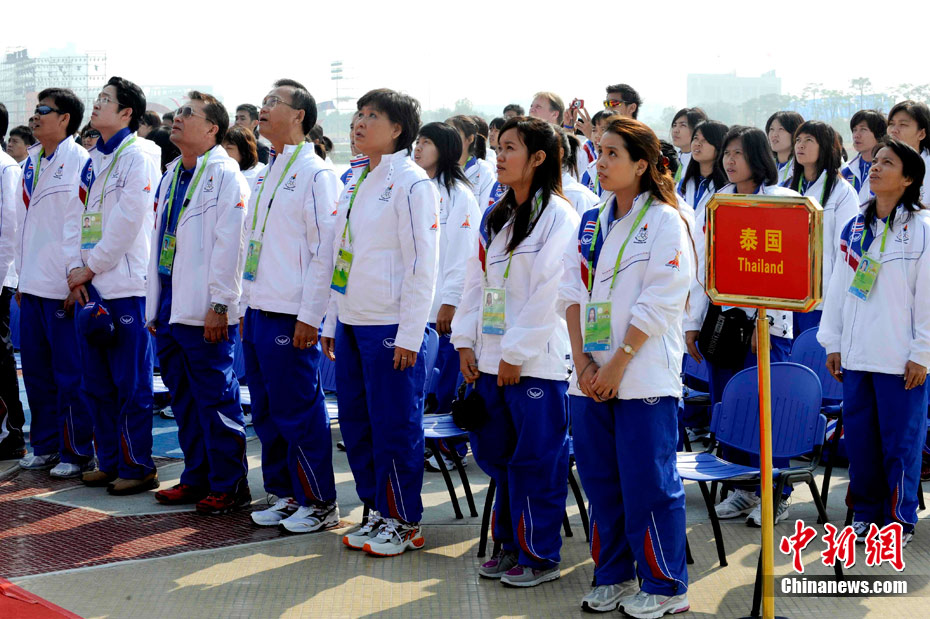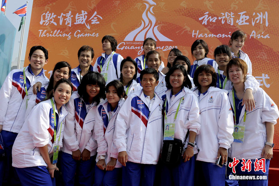 11月11日,泰國代表團舉行廣州亞運會亞運村升旗儀式。圖為泰國運動員在現場合影留念。中新社記者 王東明 攝