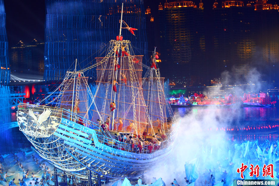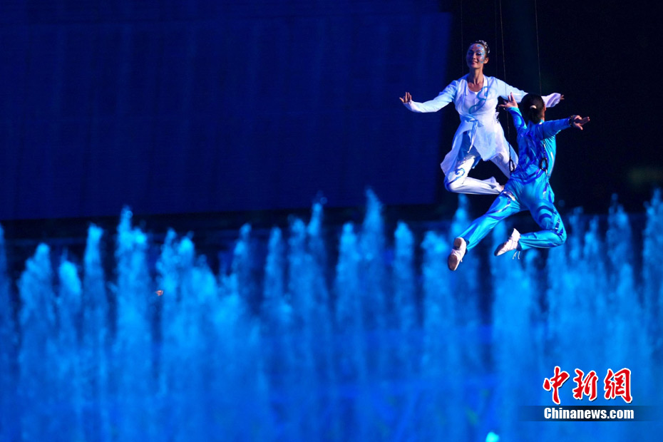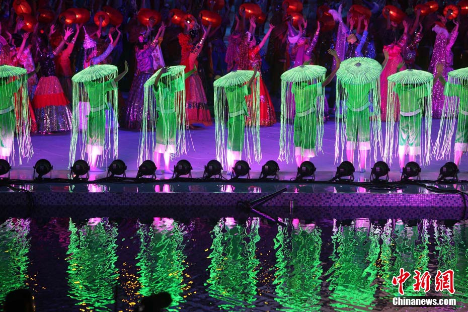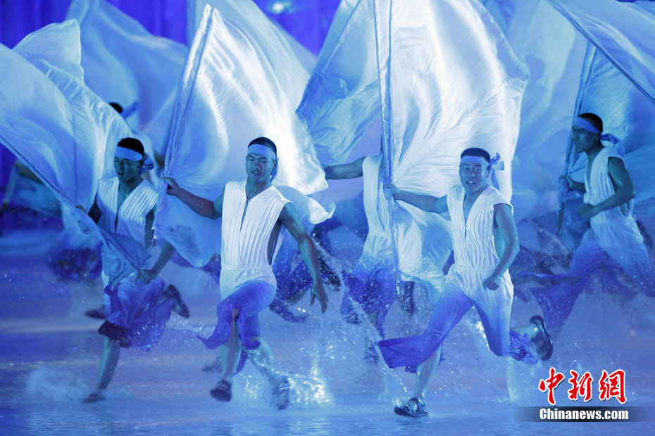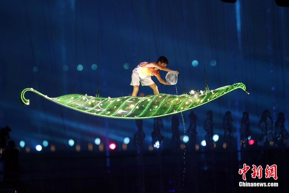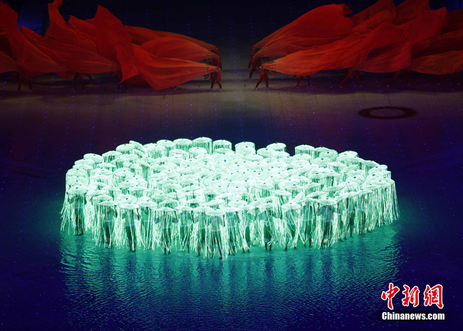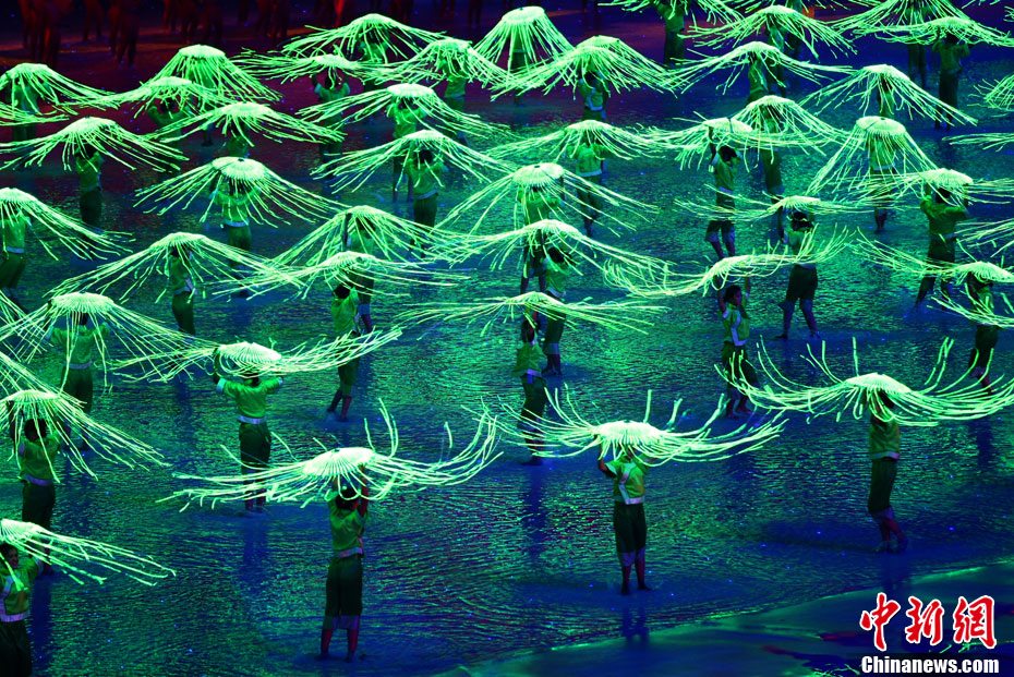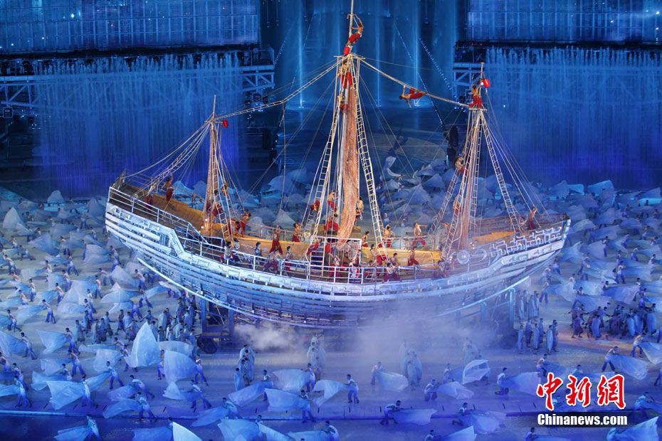 11月12日晚,第16屆亞運會開幕式在廣州海心沙舉行,宏大、絢麗的文藝匯演《啟航》給亞洲以及世界觀眾帶來藝術(shù)盛宴。水是廣州亞運開幕式最主要的創(chuàng)意元素,幕式的表演從一滴水到汪洋大海,從一葉扁舟到巨型帆船,從一汪情水到滔天巨浪。演員們用各種表演手段盡情展現(xiàn)水的魅力,表達水是生命之源、滋養(yǎng)萬物、呵護人類文明的精神內(nèi)涵,令人嘆為觀止。中新社記者 杜洋 攝