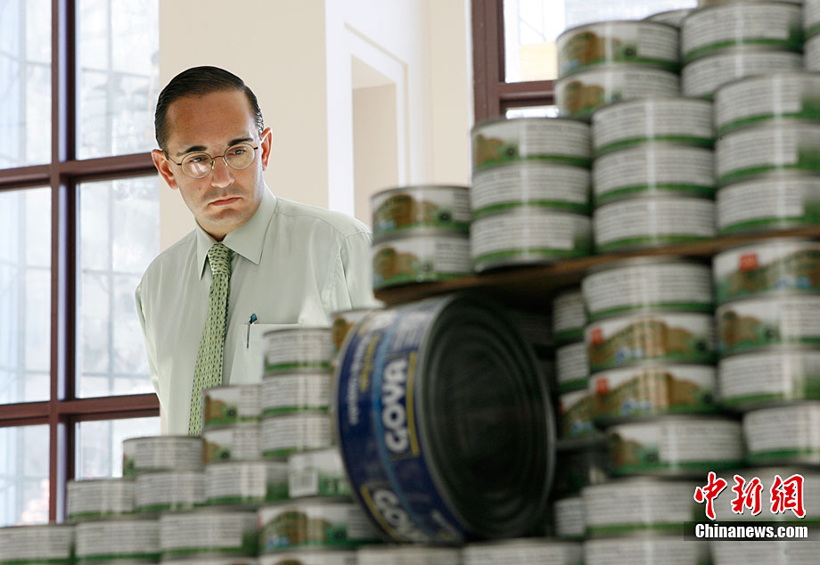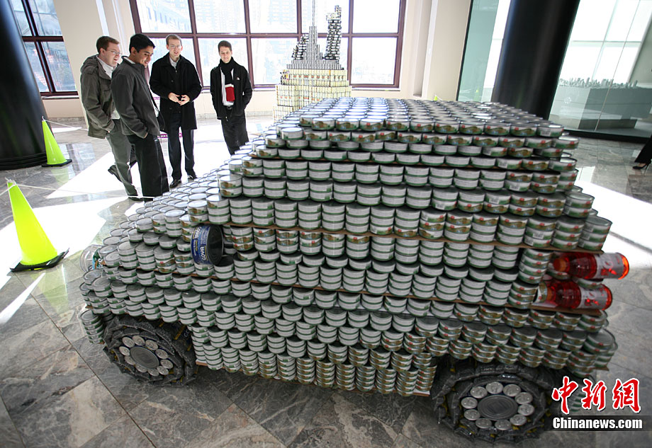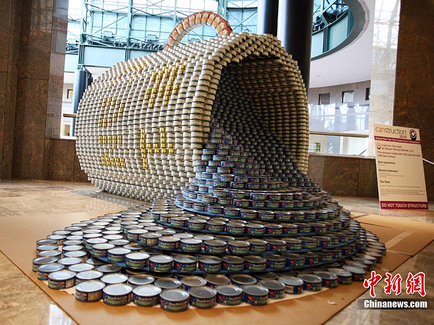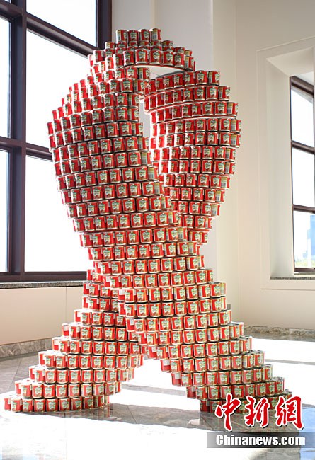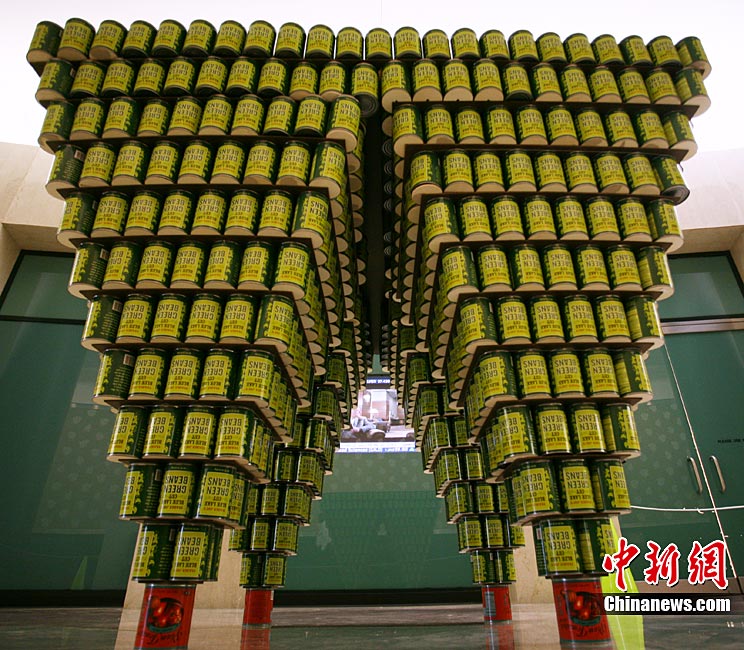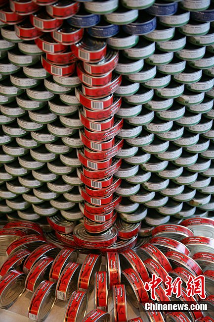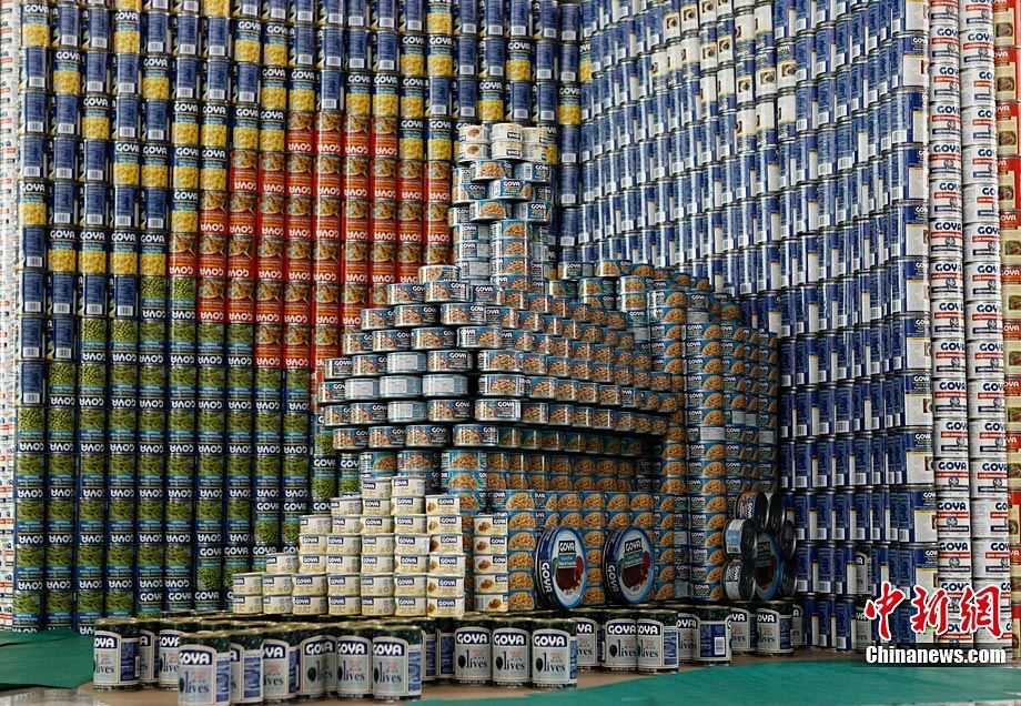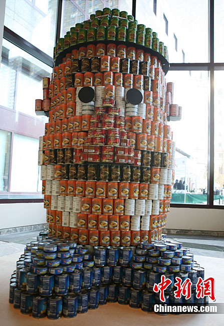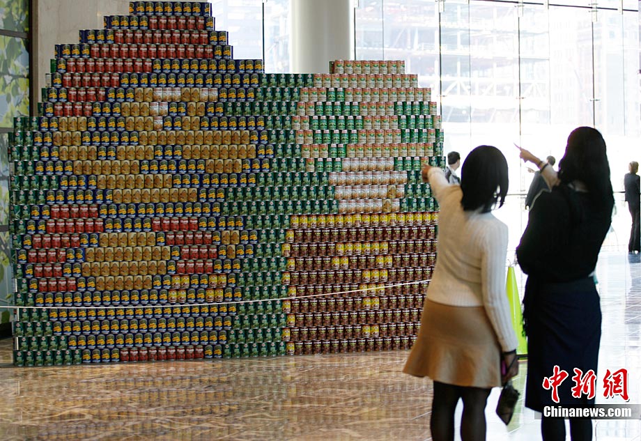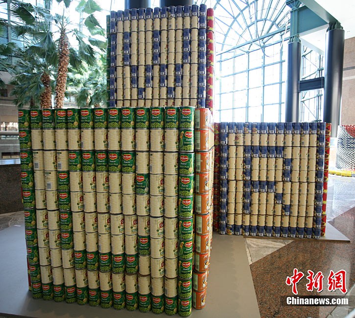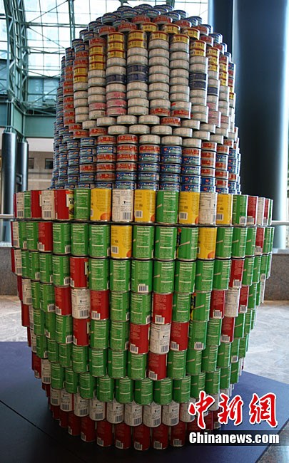 當(dāng)?shù)貢r間11月11日,美國紐約世界金融中心的冬園展出了一組用各種食品罐頭組合成的雕塑作品。此次展覽結(jié)束后,這些作品將被拆除,所有的罐頭都將被捐給慈善機(jī)構(gòu)“城市收獲”,用來援助仍在忍受饑餓的人。