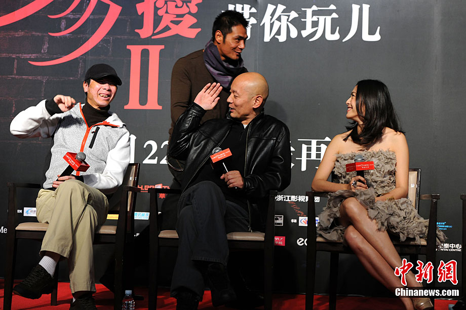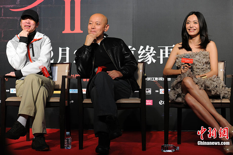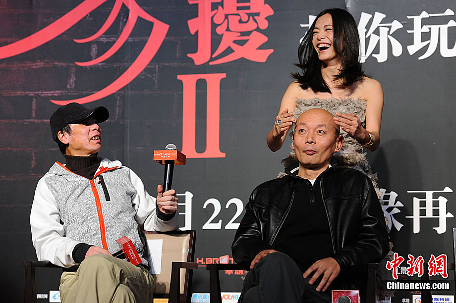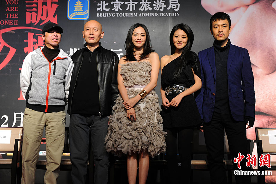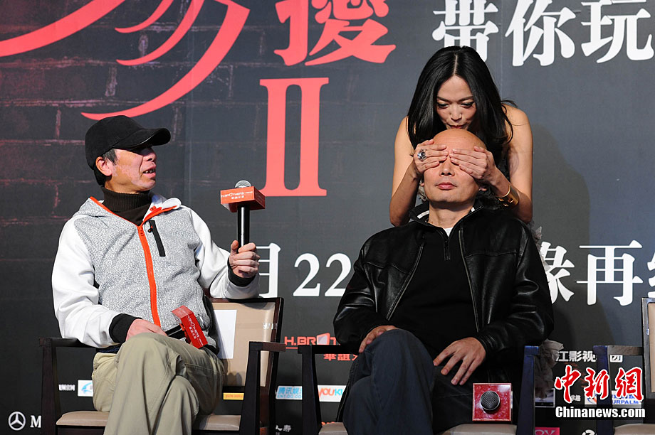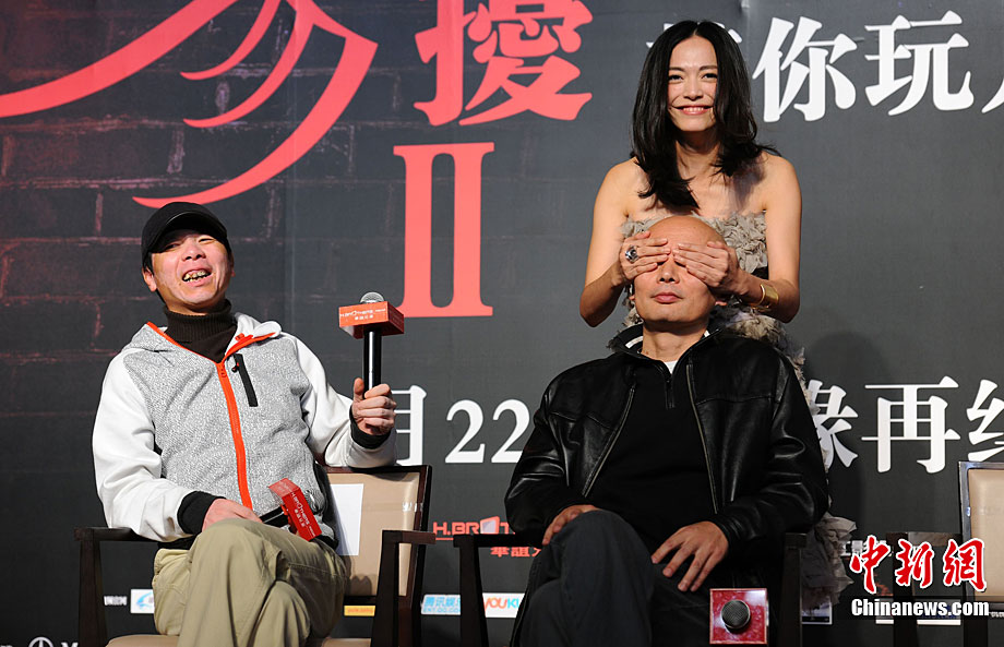 11月14日,將于12月22日賀歲上映的《非誠勿擾2》在北京舉行發(fā)布會,發(fā)布電影的美景花絮,并隆重介紹本次影片與北京市旅游局的合作。發(fā)布會上,除主演葛優(yōu)外,姚晨、安以軒、廖凡、邵兵并未參演前作《非誠勿擾》的拍攝,這也是續(xù)集新成員的第一次集體亮相。發(fā)布會上馮小剛導(dǎo)演證實(shí),“《非誠勿擾2》海報(bào)上蒙葛優(yōu)眼睛的手是姚晨的!爆F(xiàn)場媒體要求姚晨與葛優(yōu)情景重現(xiàn),盡管姚晨笑說,她跟舒淇是好姐妹,不能在人不在的時候占秦奮便宜。但還是難以抵擋眾人要求盛情難卻,現(xiàn)場蒙住了葛優(yōu)雙眼并送上香吻,葛優(yōu)事后享受地說“不錯”。中新社記者 李學(xué)仕 攝