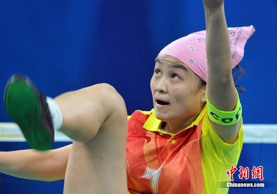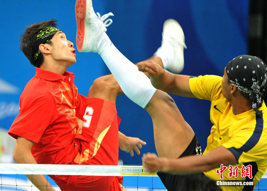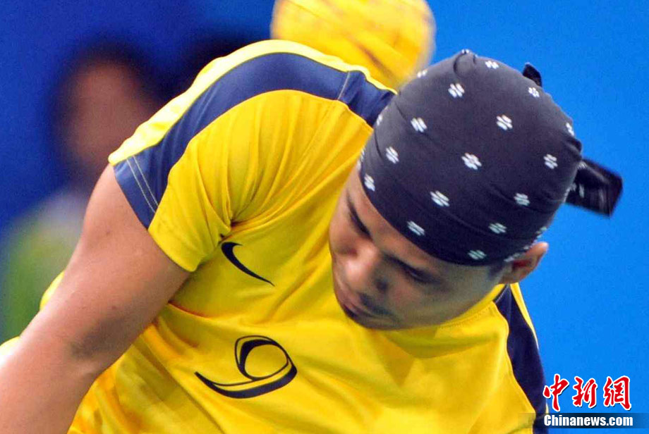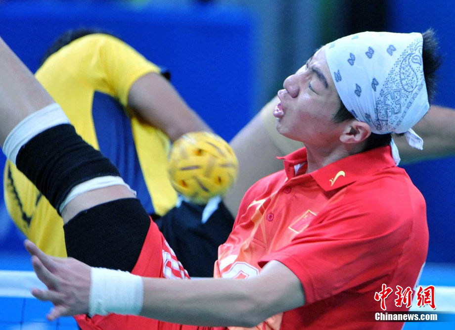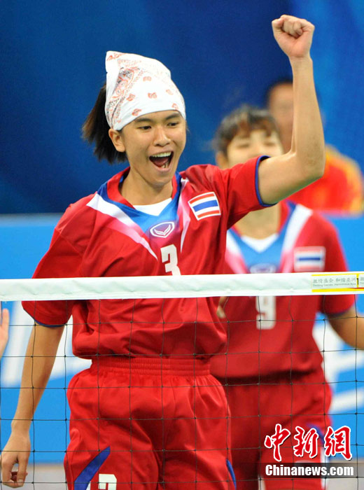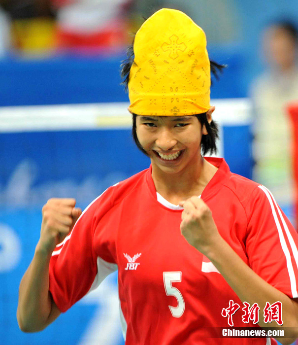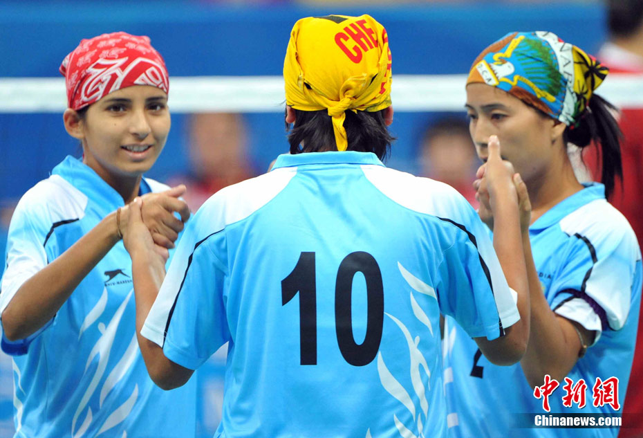 亞運(yùn)藤球賽場上,不少選手喜歡戴頭巾,色彩斑斕的頭巾把運(yùn)動場變成了一個“T臺秀場”。中新社記者 柯小軍 攝