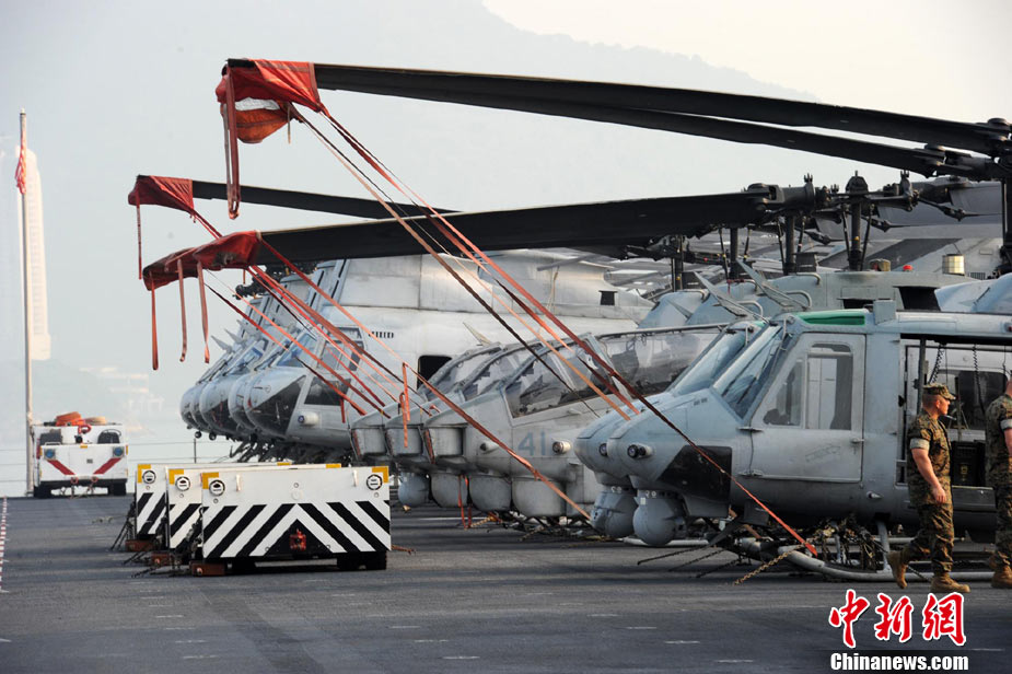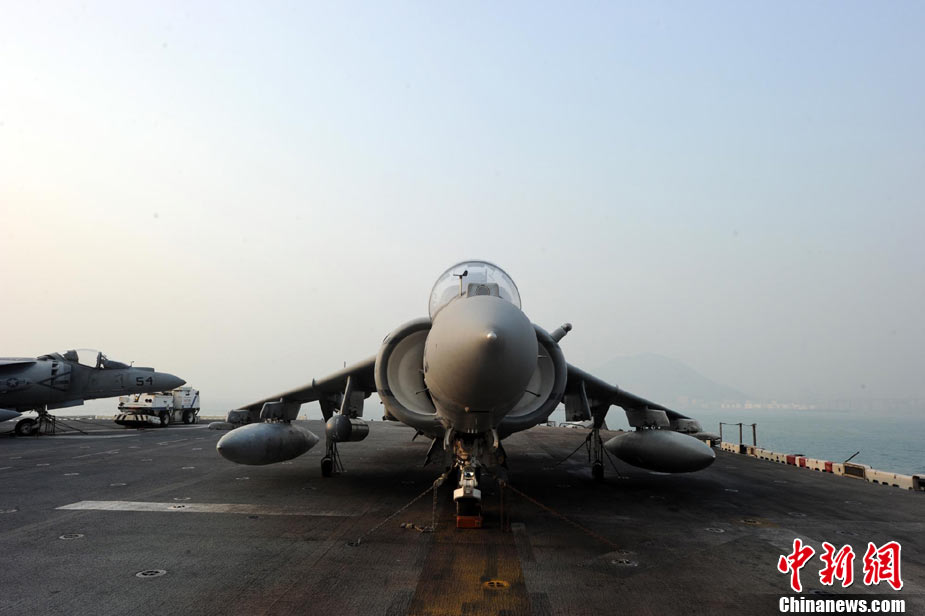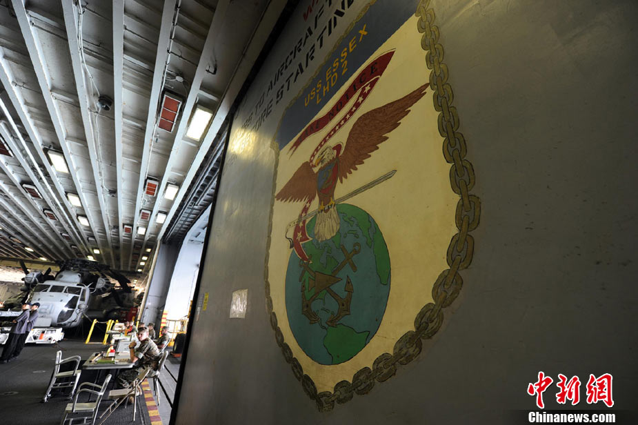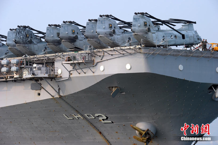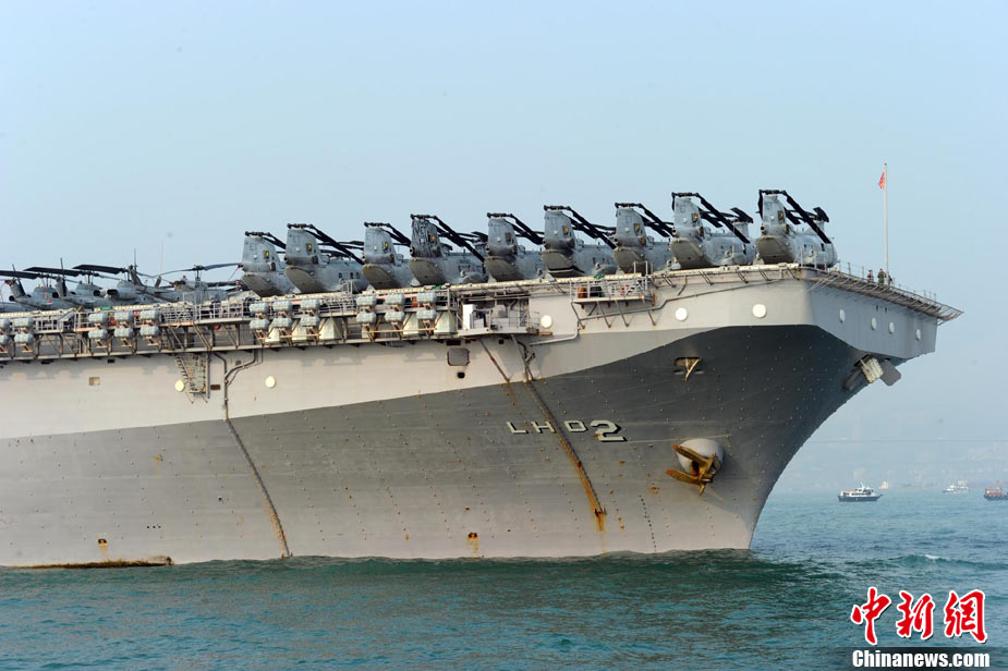 有“鋼鐵短吻鱷”之稱的“埃塞克斯”號,搭載有AV-8B“鷂”式戰(zhàn)機(jī)、CH-53E“海上種馬”直升機(jī)、CH-46E“海上騎士”直升機(jī)、UH-1N超級休伊直升機(jī)等逾30架各型機(jī)型,以及超過2200名船員和海軍官兵。中新網(wǎng)記者 鄭祚聲 攝
