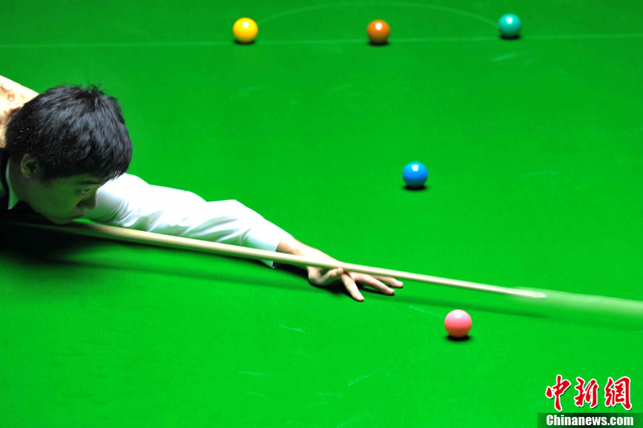 20日晚,中國選手丁俊暉2:4不敵中國香港選手傅家俊,奪得斯諾克亞軍。 中新社記者 柯小軍 攝