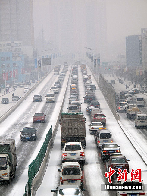 新疆烏魯木齊11月22日上午再度降下大雪,由于大雪的緣故,烏魯木齊街道部分路段交通擁堵,車輛排起長(zhǎng)隊(duì)。中新社記者 孫亭文 攝