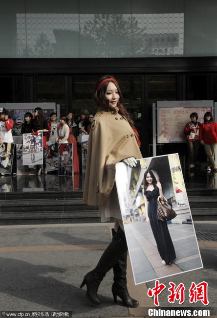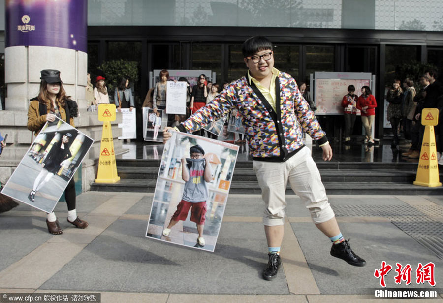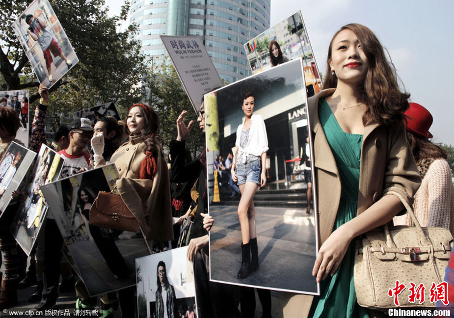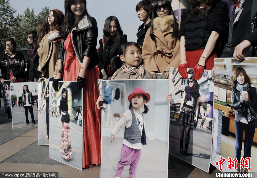 11月23日,在杭州廣場上,百余名身穿時尚服飾,化著個性妝扮的年輕人,手拿自己的靚照,走上街頭,向人們大膽展示自己的風(fēng)采。右娃 攝 圖片來源:CFP視覺中國