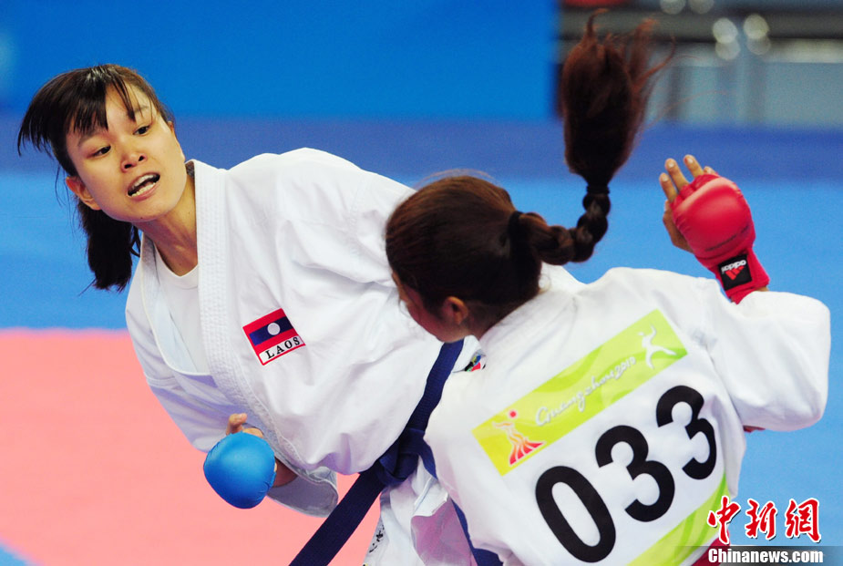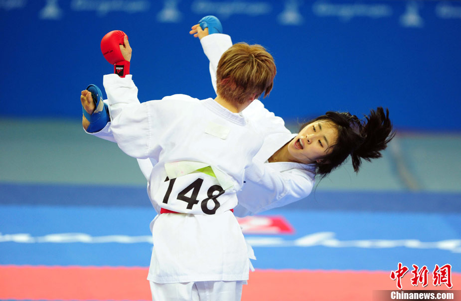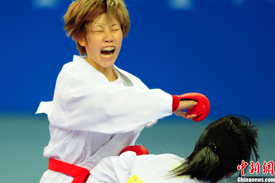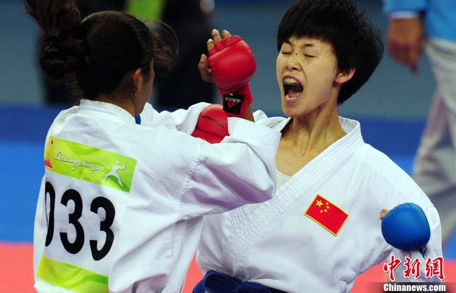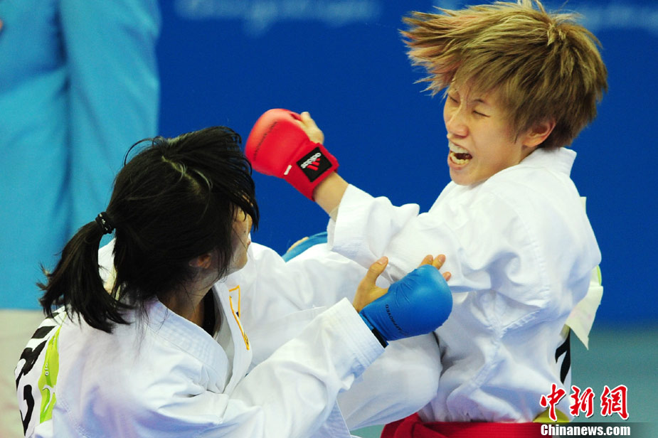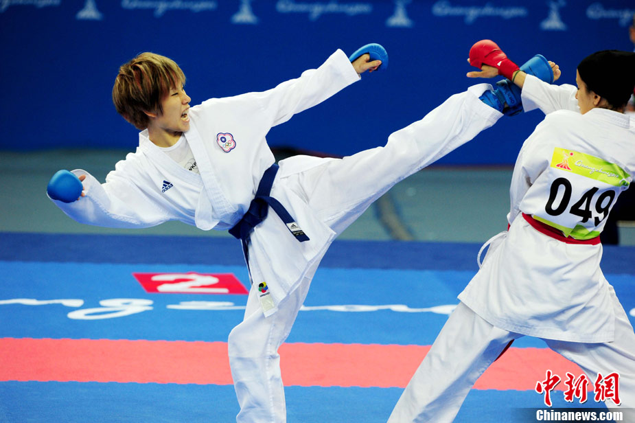 11月24日,在第16屆廣州亞運(yùn)會(huì)空手道項(xiàng)目比賽中,來自亞洲伊朗、印度尼西亞、日本、泰國、韓國、菲律賓、越南、中國、中國澳門、中華臺(tái)北等女子空手道“霸王花”爭摘亞運(yùn)桂冠。 中新社記者 陳文 攝