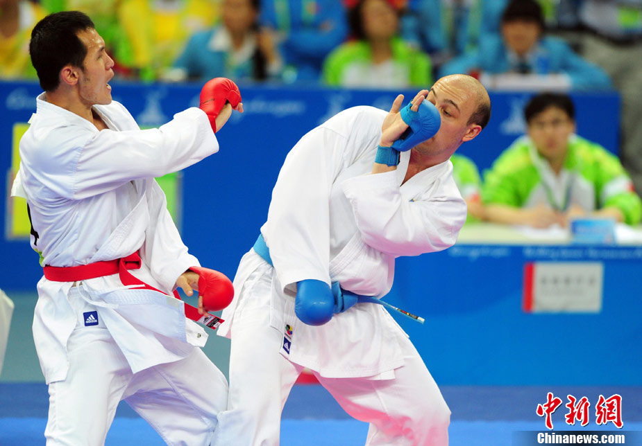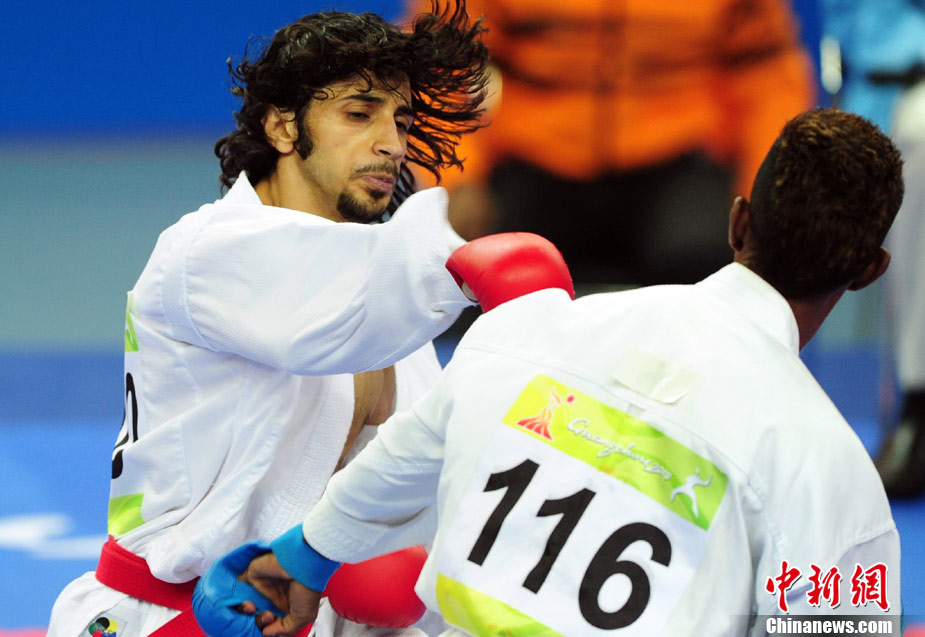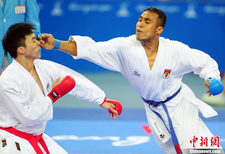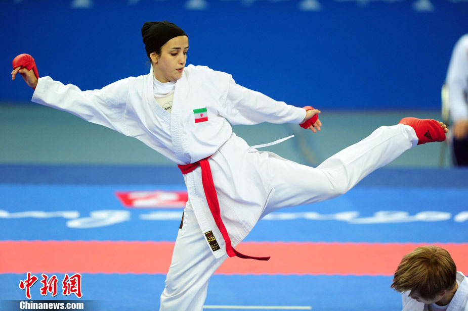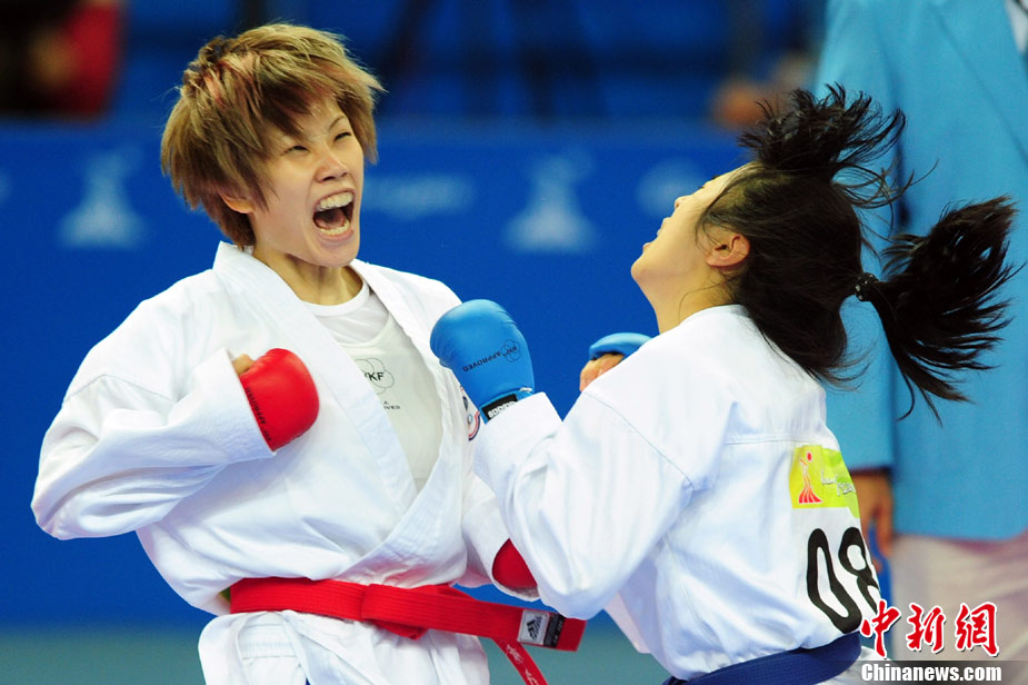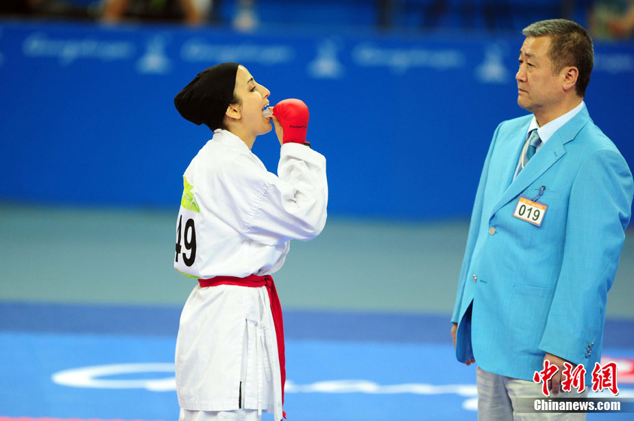 11月24日,在第16屆廣州亞運(yùn)會(huì)空手道項(xiàng)目比賽中,來自亞洲伊朗、印度尼西亞、日本、泰國、韓國、菲律賓、越南、中國、中國澳門、中華臺(tái)北等女子空手道“霸王花”爭摘亞運(yùn)桂冠。 中新社記者 陳文 攝