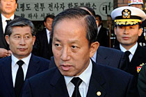 韓國總統(tǒng)秘書室室長任太熙11月25日在青瓦臺召開記者會說,李明博受理了金泰榮的辭呈!疤彀病迸炇录l(fā)生后,金泰榮于5月1日引咎辭職,但為了后續(xù)措施和韓美防長會談等問題,李明博一直未受理辭呈。最近,軍隊內(nèi)陸續(xù)發(fā)生戰(zhàn)機墜落等事故,并為整頓軍內(nèi)氣氛,李明博今天受理了辭呈。此外,還將替換青瓦臺國防秘書官。圖為25日韓國國防長官金泰榮前往醫(yī)院看望因朝韓“炮戰(zhàn)”受傷人員。