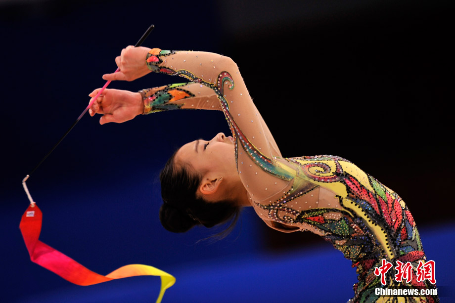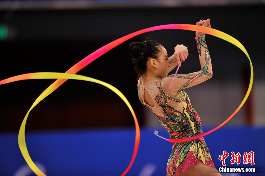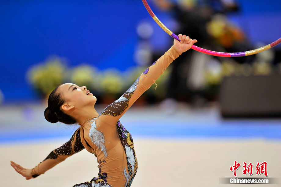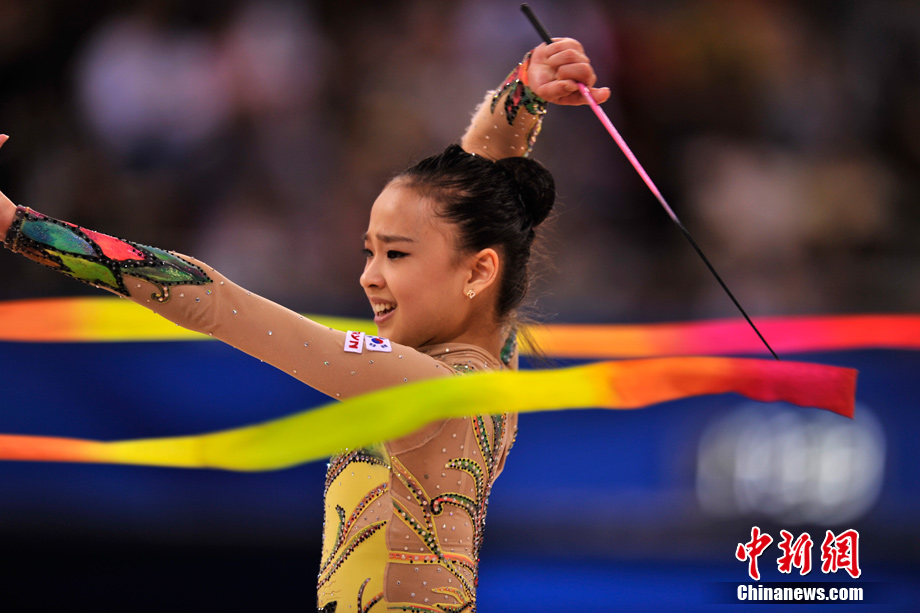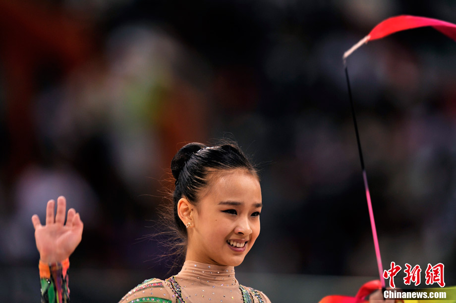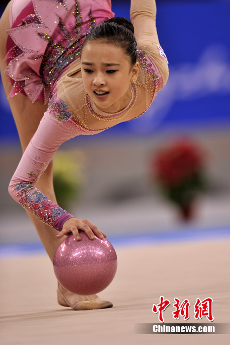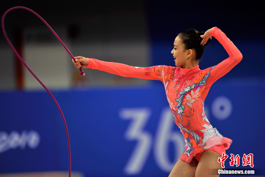 蘿莉,英文名為L(zhǎng)OLI,本意指12歲以下的小女孩,后泛指天真可愛(ài)的小女生。15歲的韓國(guó)藝術(shù)體操選手孫妍在,憑借著修長(zhǎng)的身材、姣好的面容,以及明亮的眼眸,一直被人稱為“藝術(shù)體操屆的金妍兒”?胺Q廣州亞運(yùn)會(huì)“小蘿莉”中的NO.1。圖為孫妍在在亞運(yùn)藝術(shù)體操比賽首日的精彩表現(xiàn)。中新網(wǎng)記者 金碩 攝
