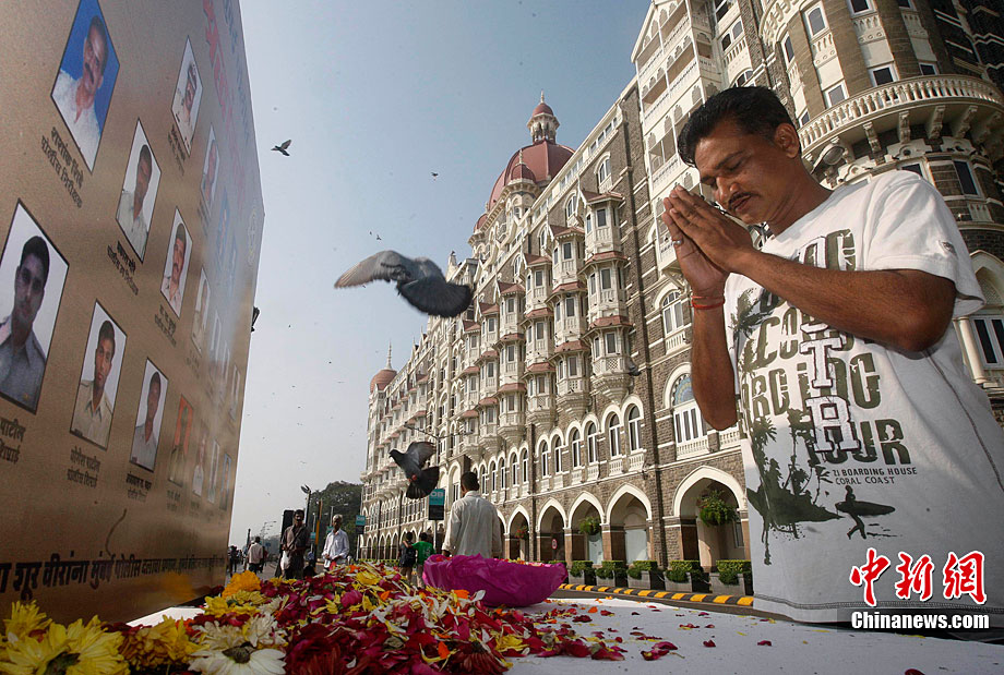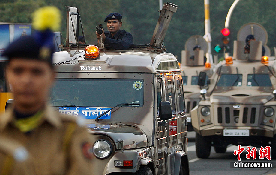 11月26日,警察在印度孟買的海濱大道上舉行閱兵式,悼念恐怖襲擊事件中的遇難者并表達(dá)反恐決心。2008年11月26日夜至29日,印度商業(yè)中心孟買的泰姬馬哈酒店、奧貝羅伊酒店、猶太人中心以及孟買火車站等地遭遇連環(huán)恐怖襲擊,造成至少195人死亡,大約300人受傷。
