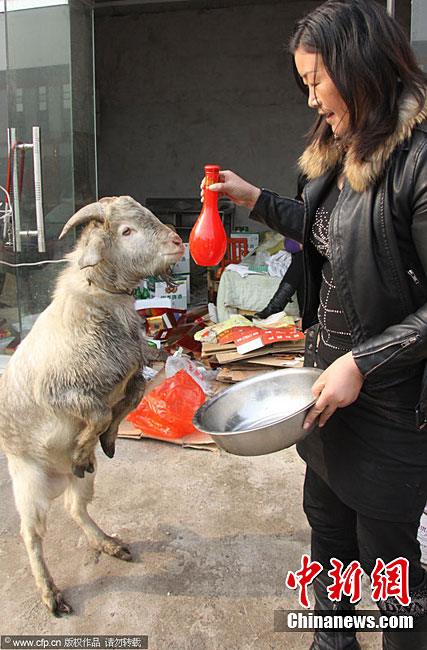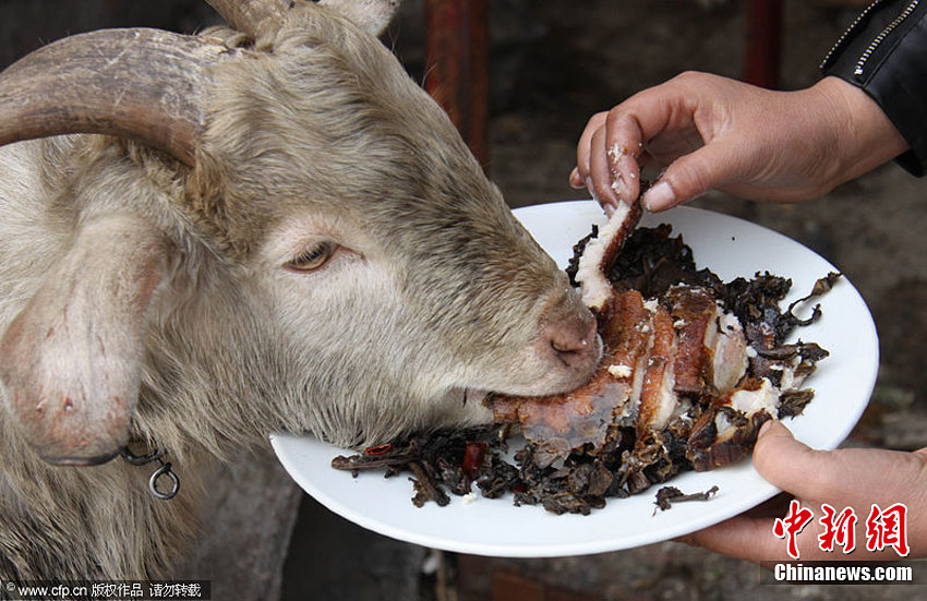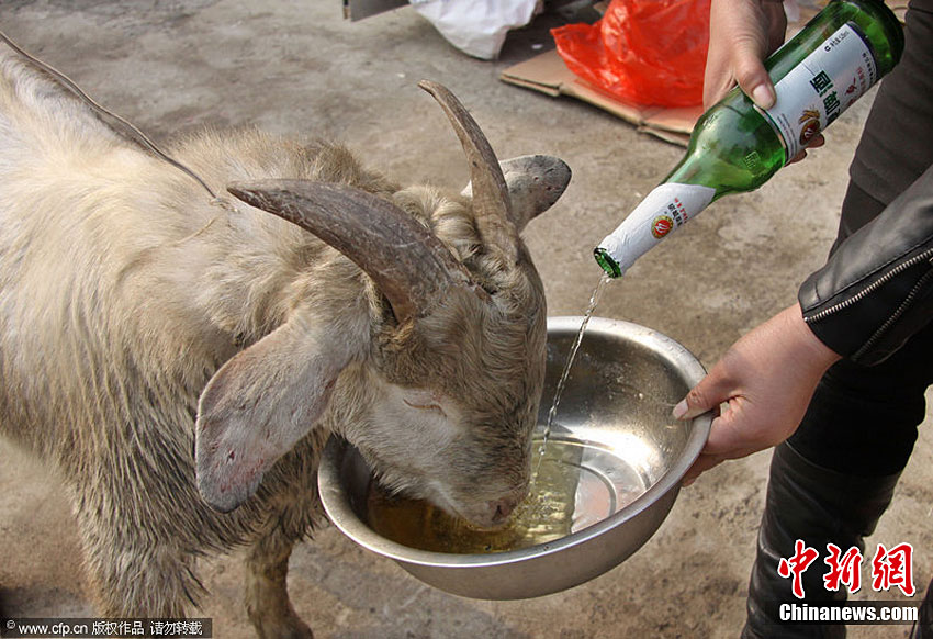 11月29日,在山東省臨沂市羅莊區(qū)盛莊街道,“酒鬼山羊”在大口喝酒。據(jù)悉,臨沂市羅莊區(qū)盛莊街道亓女士家養(yǎng)了一只波爾山羊,平時(shí)和狗拴在一起,經(jīng)常用酒店的剩飯菜喂狗,兩個(gè)月前,亓女士發(fā)現(xiàn)這只山羊開始和狗爭食吃,雞魚肉蛋樣樣品嘗,看熱鬧的村民試著用酒喂食,沒想這只山羊?qū)ζ【坪桶拙苼碚卟痪,而且酒后還撒潑到處頂撞人。朱武濤 攝 圖片來源:CFP視覺中國
