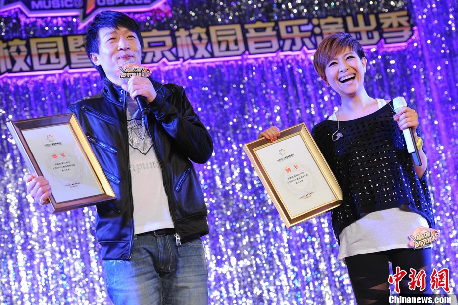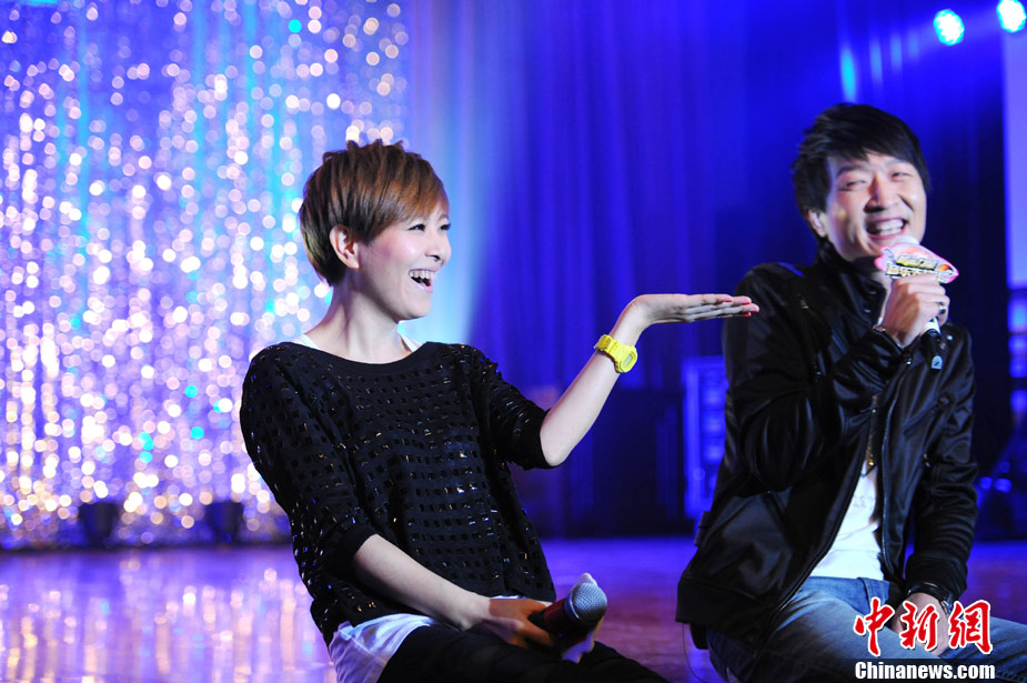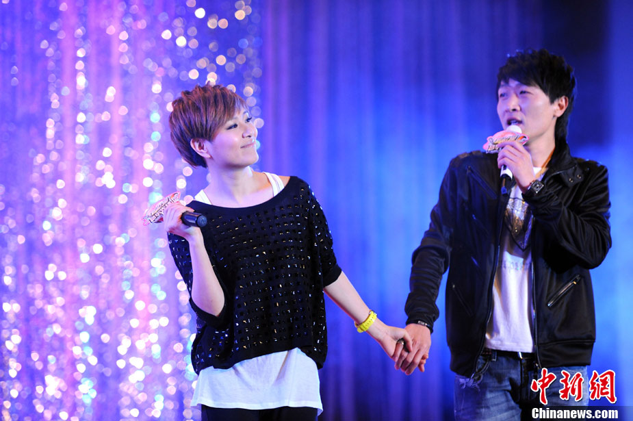 11月29日晚,2010公益進校園暨北京校園音樂演出季活動之李慧珍&樊凡主題歌友會在北京化工大學舉行,兩位歌手為歌迷們獻上了一首首經(jīng)典的曲目。因演唱熱播電視劇《蝸居》主題曲爆紅的樊凡還親自譜曲了情歌《只需要一首歌》,并與李慧珍牽手甜蜜合唱,F(xiàn)場,積極投身愛心公益事業(yè)的樊凡和李慧珍還為貧困學生頒發(fā)了“媽媽的年夜飯”善款,并雙雙被北京婦女兒童基金會聘為“愛心大使”。圖為李慧珍、樊凡牽手獻唱。中新社記者 李學仕 攝
