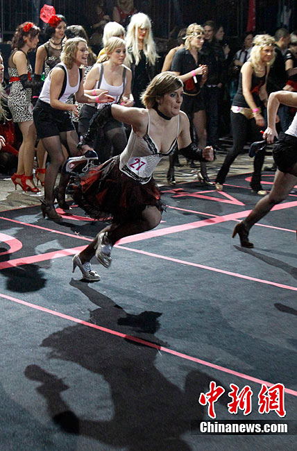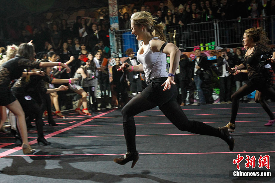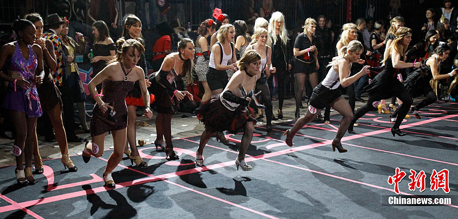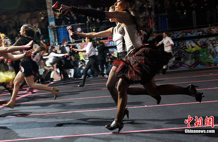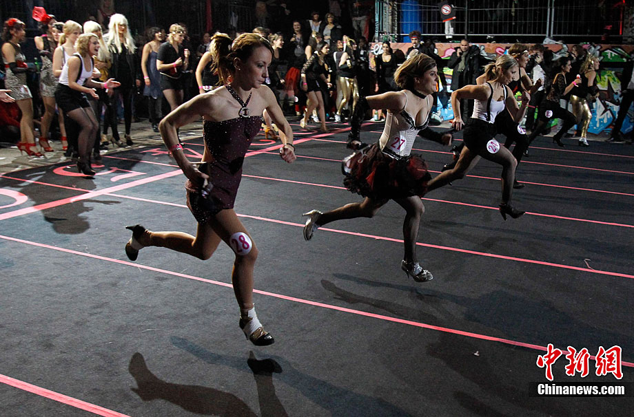 近日,第三屆Sarenza高跟鞋短跑比賽在法國(guó)巴黎舉行。來自法國(guó)和英國(guó)的選手參加了3×60米接力比賽。據(jù)悉,要想?yún)⒓舆@項(xiàng)趣味比賽,參賽者所穿的高跟鞋不得低于8厘米。