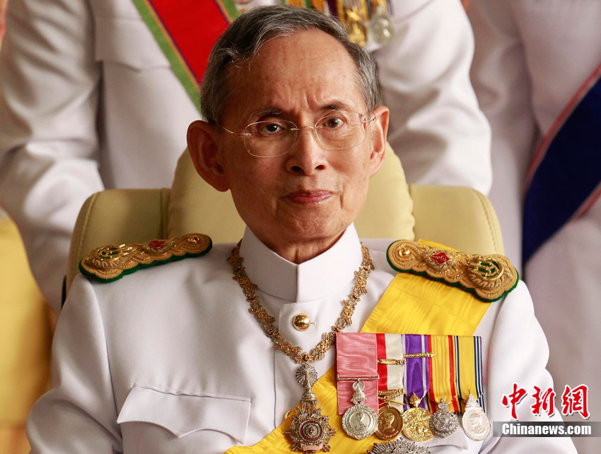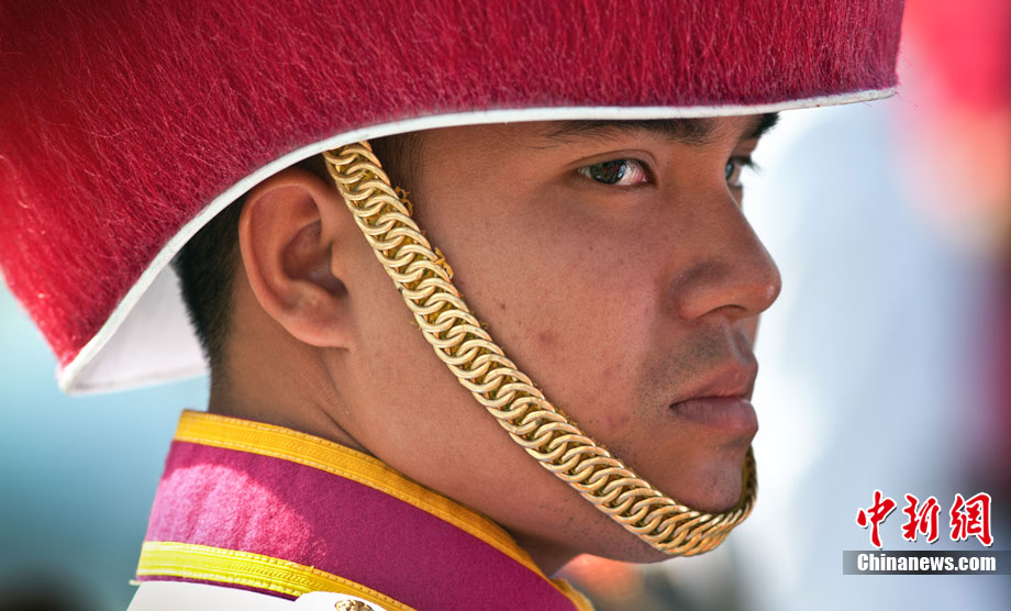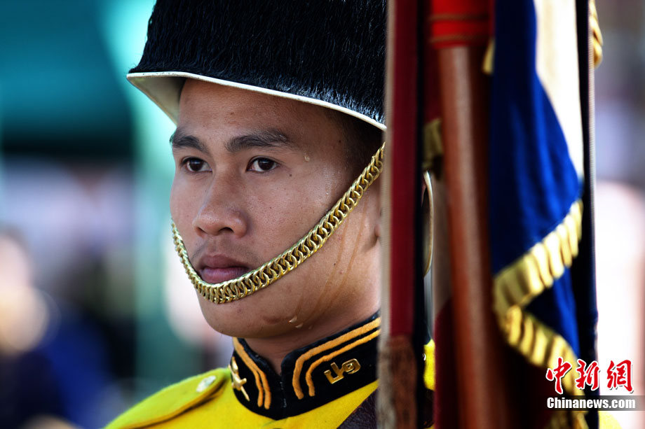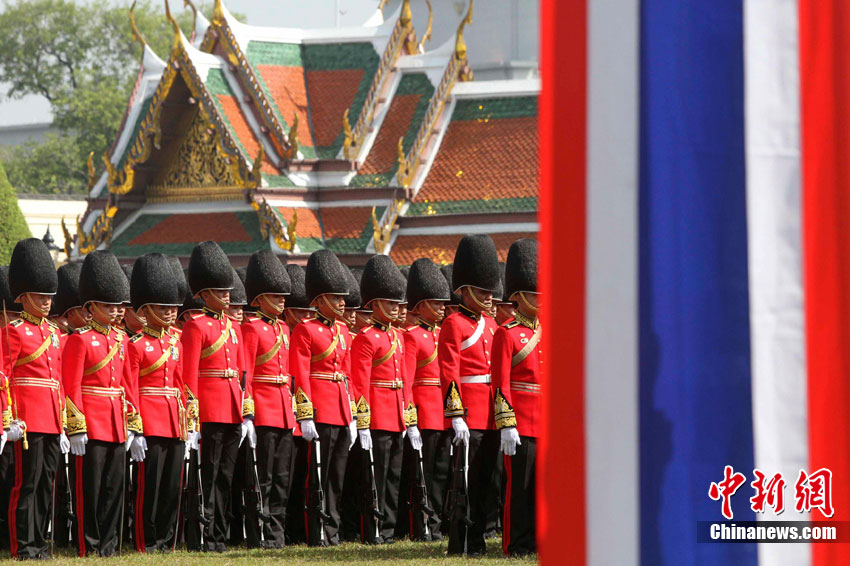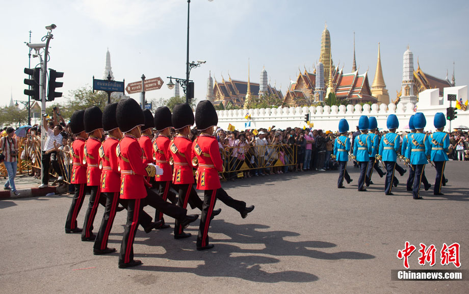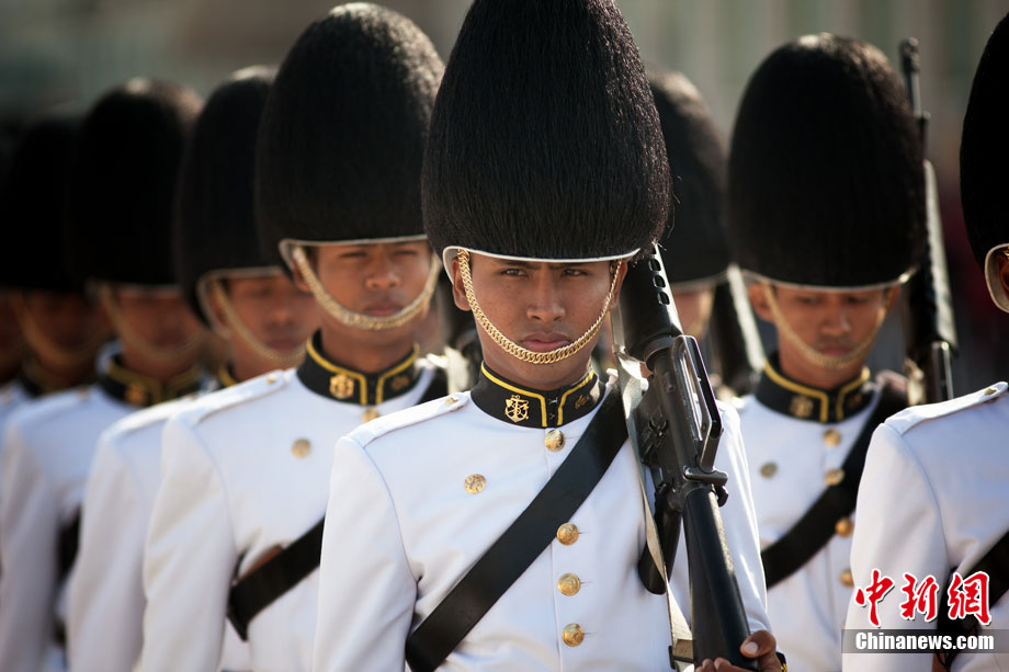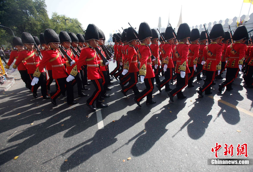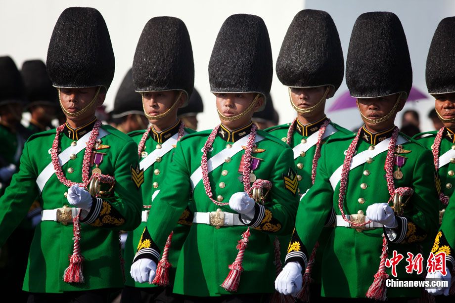 當(dāng)?shù)貢r間12月5日,泰國各界齊聚曼谷市中心的大王宮,慶祝泰王普密蓬83歲大壽。泰國皇家衛(wèi)隊士兵身著紅、綠、黑、蘭等各種顏色的軍服進行游行,為泰王慶祝生日。