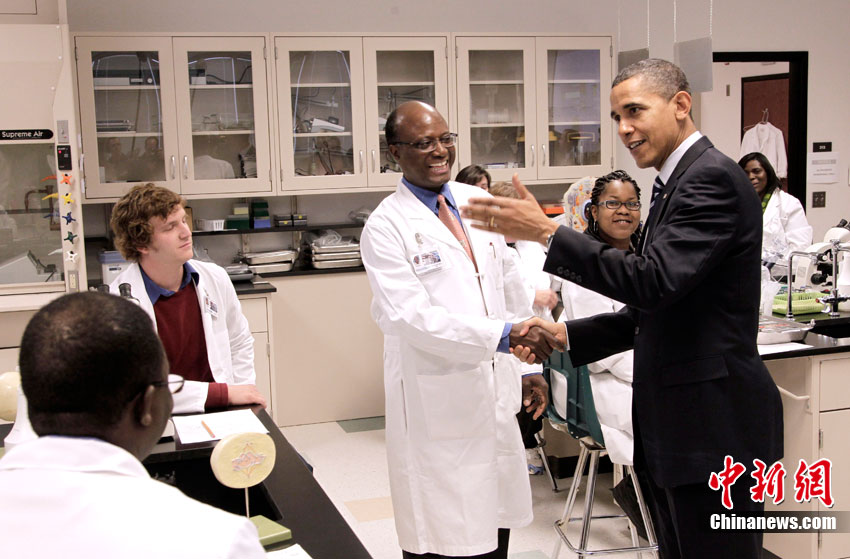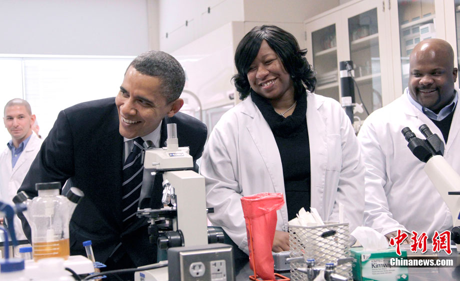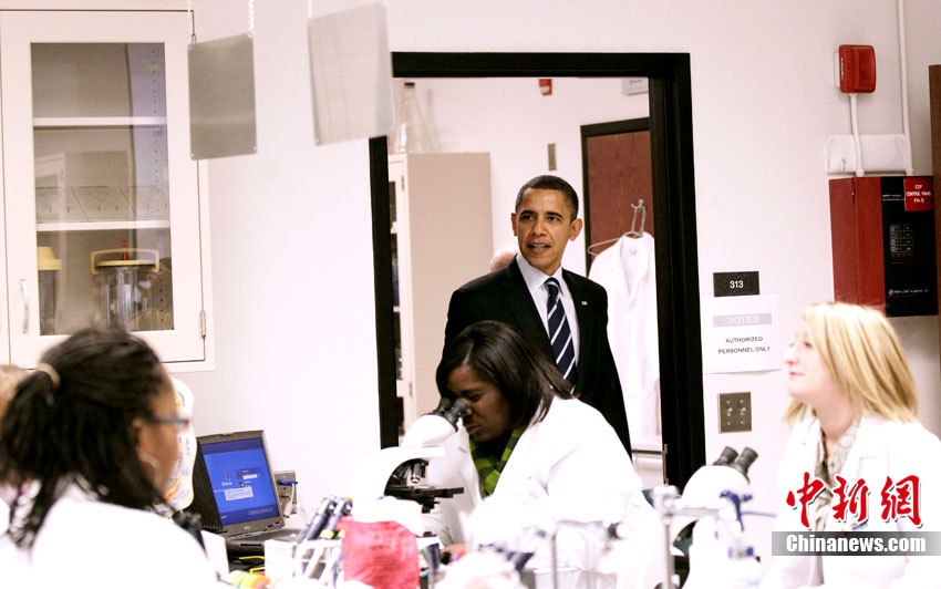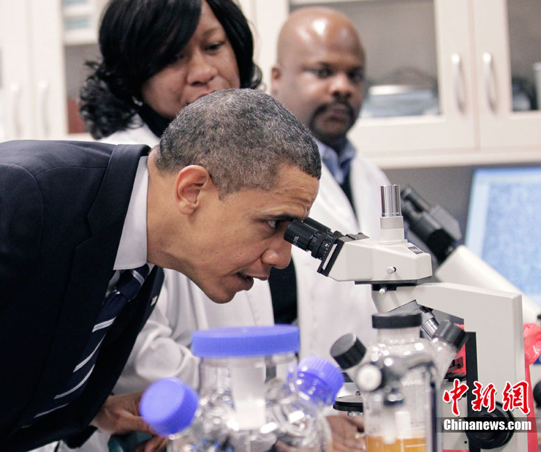 美國總統(tǒng)奧巴馬參觀社區(qū)大學(xué)試用顯微鏡