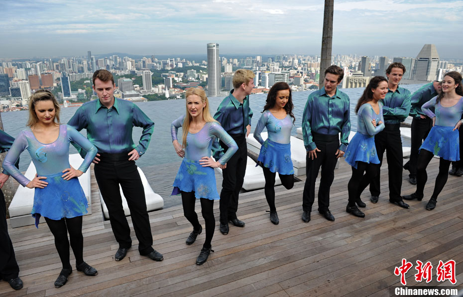 圖為大河之舞愛(ài)爾蘭舞蹈團(tuán)成員在新加坡濱海灣金沙酒店的空中花園合影。