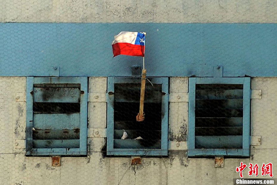 圖為一名被困者從屋內伸出手揮舞智利國旗。據了解,死者多被火災引發(fā)的濃煙嗆死。