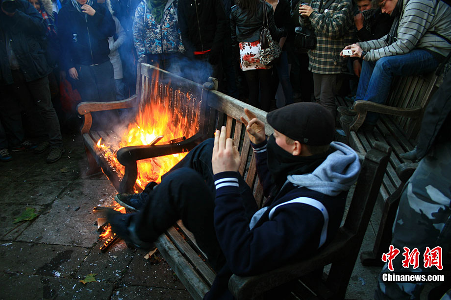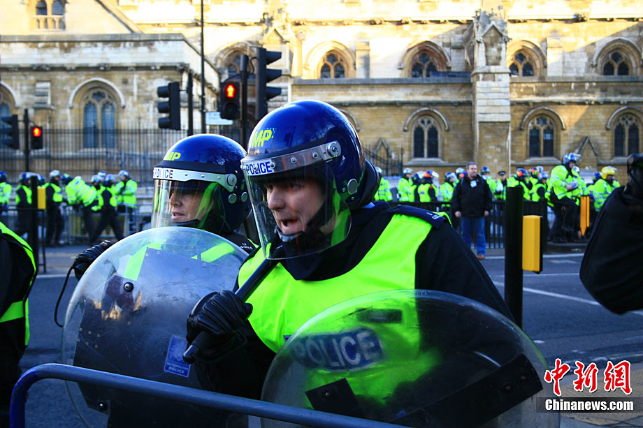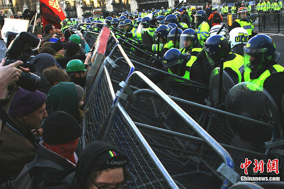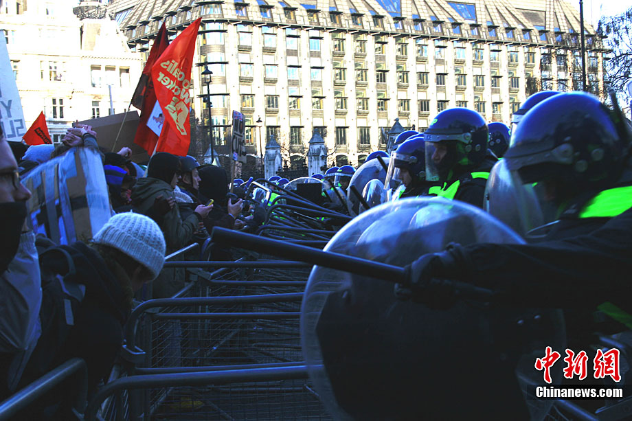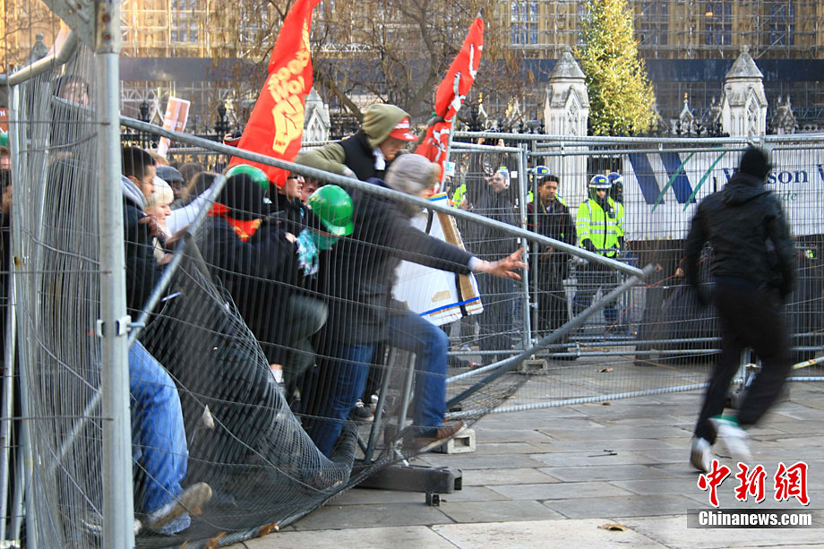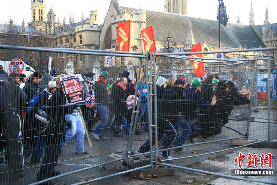 當(dāng)?shù)貢r(shí)間12月9日,為抗議議會(huì)表決通過政府有關(guān)大學(xué)學(xué)費(fèi)上漲提案,倫敦爆發(fā)大規(guī)模學(xué)生抗議示威,引發(fā)示威者與警方?jīng)_突,37人受傷,15人被捕。圖為示威者沖破議會(huì)大廈前廣場(chǎng)施工柵欄。中新社記者 魏群 攝