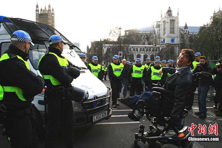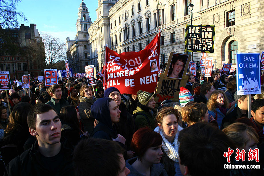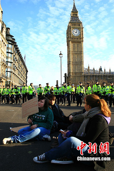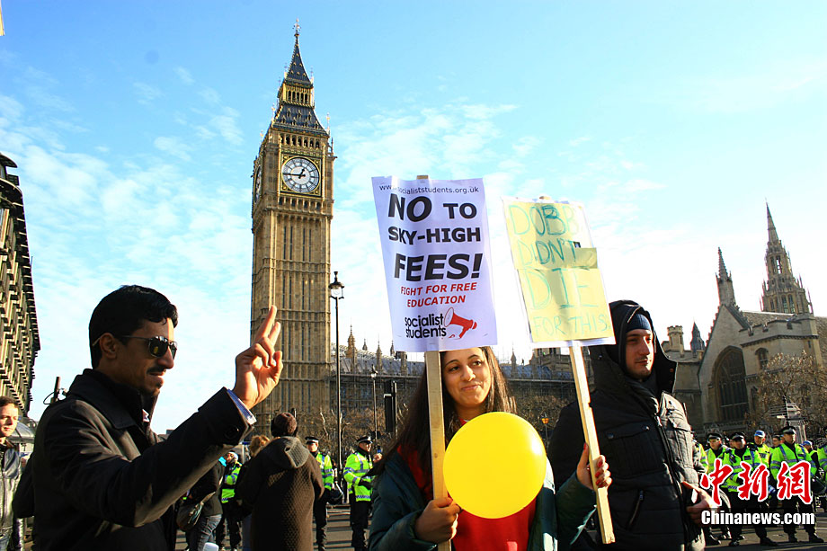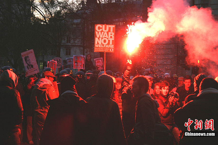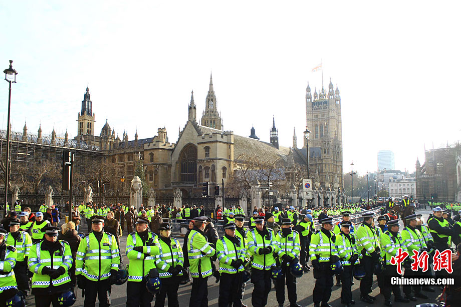 當(dāng)?shù)貢r(shí)間12月9日,為抗議議會(huì)表決通過政府有關(guān)大學(xué)學(xué)費(fèi)上漲提案,倫敦爆發(fā)大規(guī)模學(xué)生抗議示威,引發(fā)示威者與警方?jīng)_突,37人受傷,15人被捕。圖為示威者沖破議會(huì)大廈前廣場(chǎng)施工柵欄。中新社記者 魏群 攝