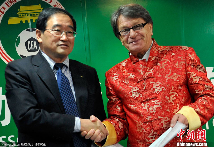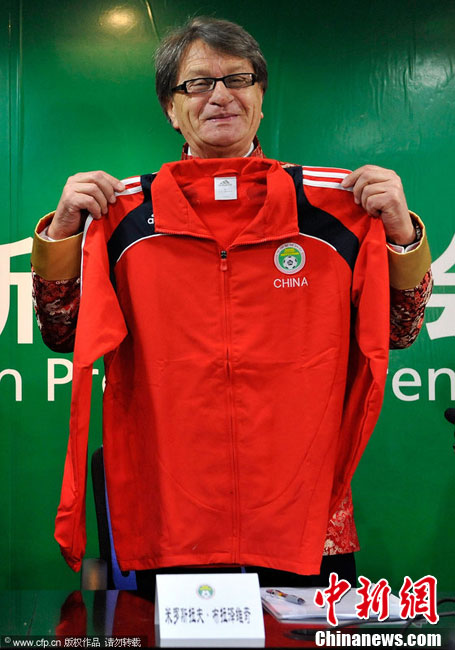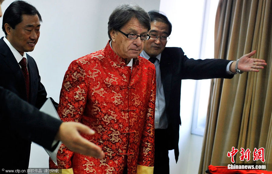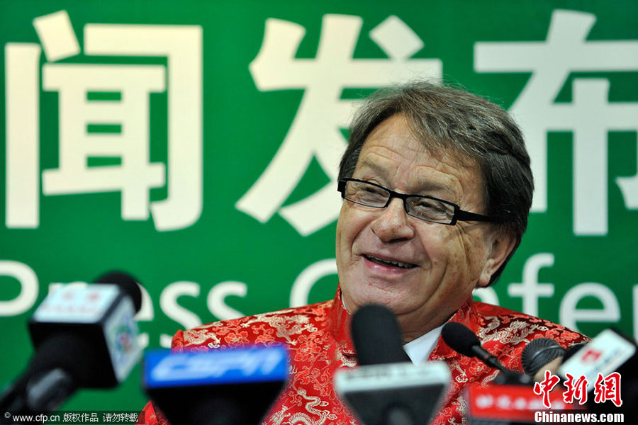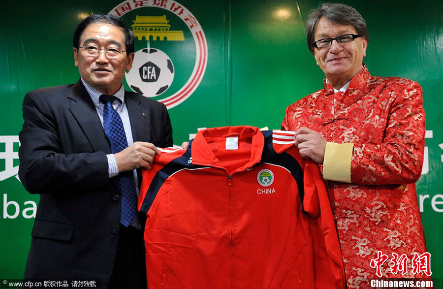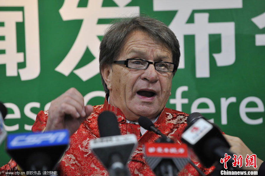 12月11日,中國(guó)北京,中國(guó)足協(xié)召開(kāi)新聞發(fā)布會(huì),前上海申花主帥布拉澤維奇正式出任國(guó)奧主帥。圖為布拉澤維奇著唐裝出席發(fā)布會(huì)。圖片來(lái)源:CFP視覺(jué)中國(guó)