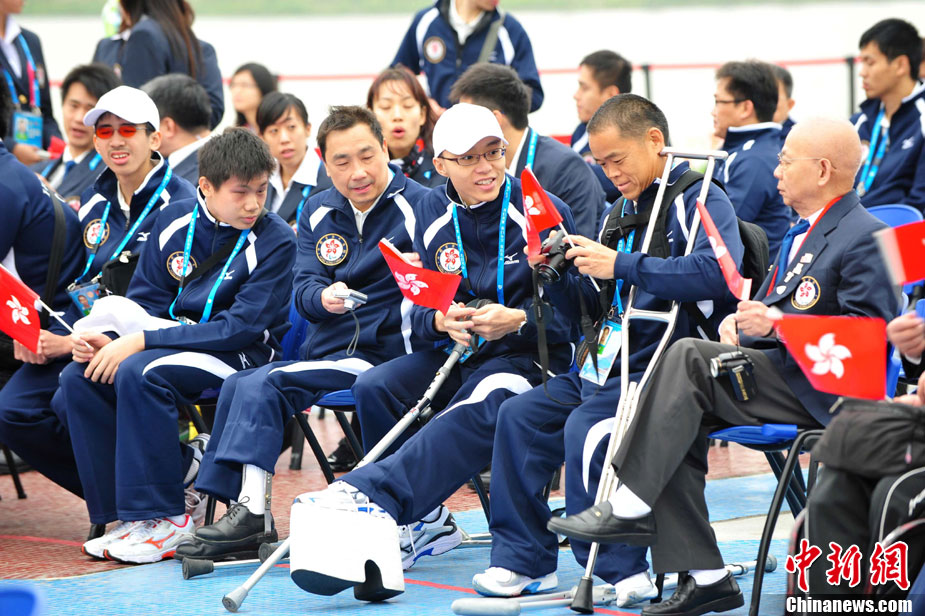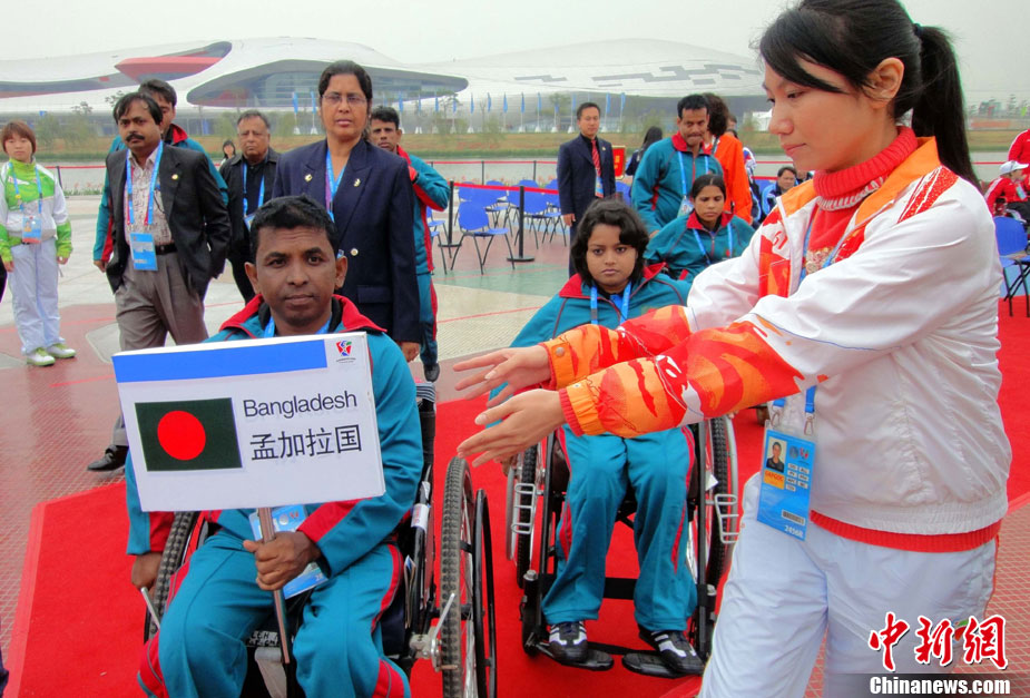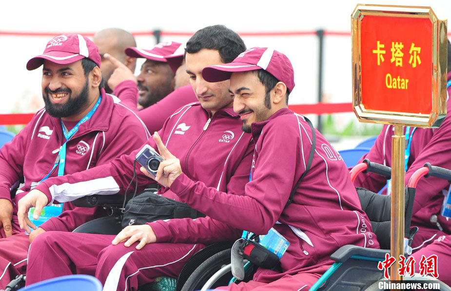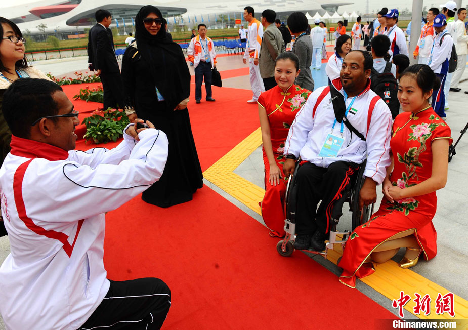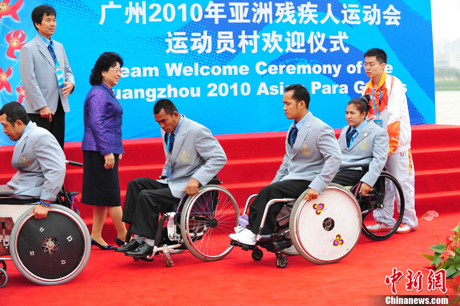 12月11日,廣州亞殘運會運動員村舉行體育代表團歡迎儀式,來自卡塔爾、尼泊爾、土庫曼斯坦、泰國、巴林、中國香港、中國澳門等國家和地區(qū)的運動員、教練員、官員在運動員村共享歡樂與榮耀。