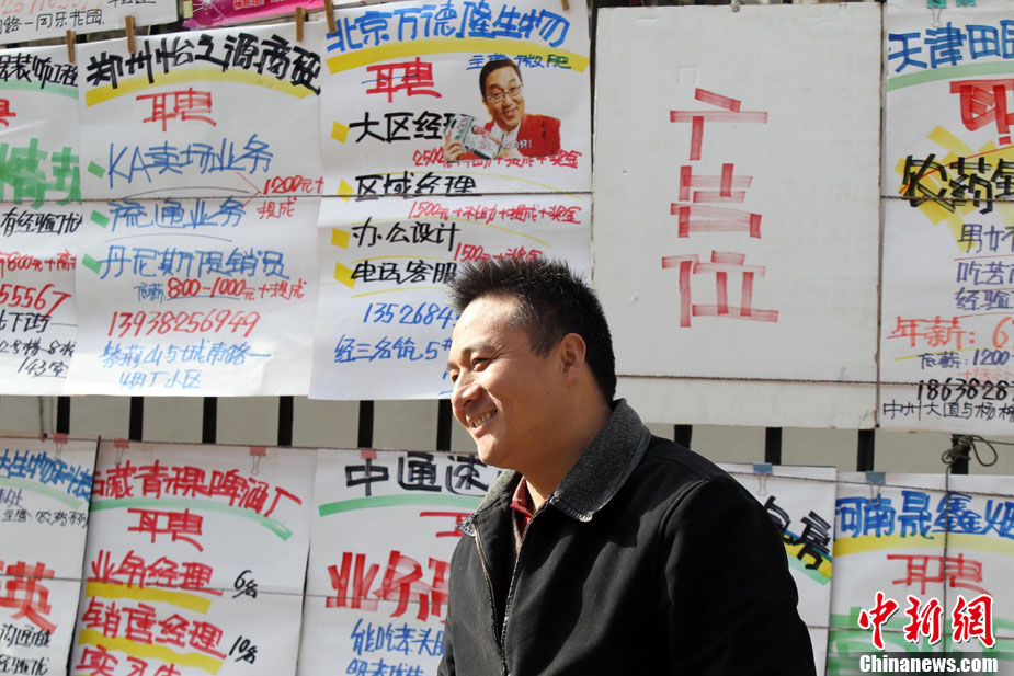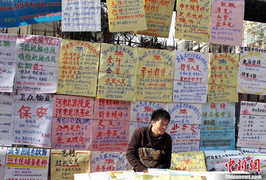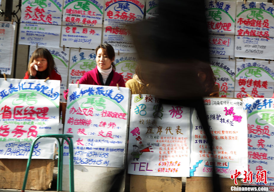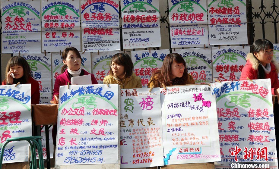 12月11日,年終歲末,在河南省人才市場的馬路上招牌用工者的美女招聘者坐成排等候應聘者前來咨詢。許多企業(yè)反映,每到年底都有部分員工請假回家相親結(jié)婚或與家人團聚過年,造成工廠人手不夠。