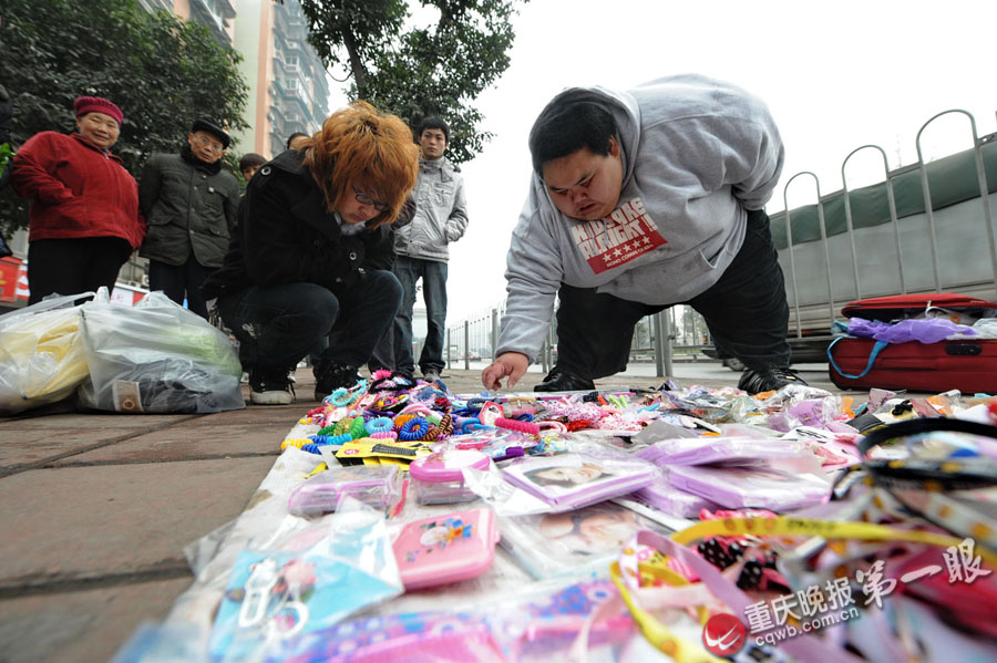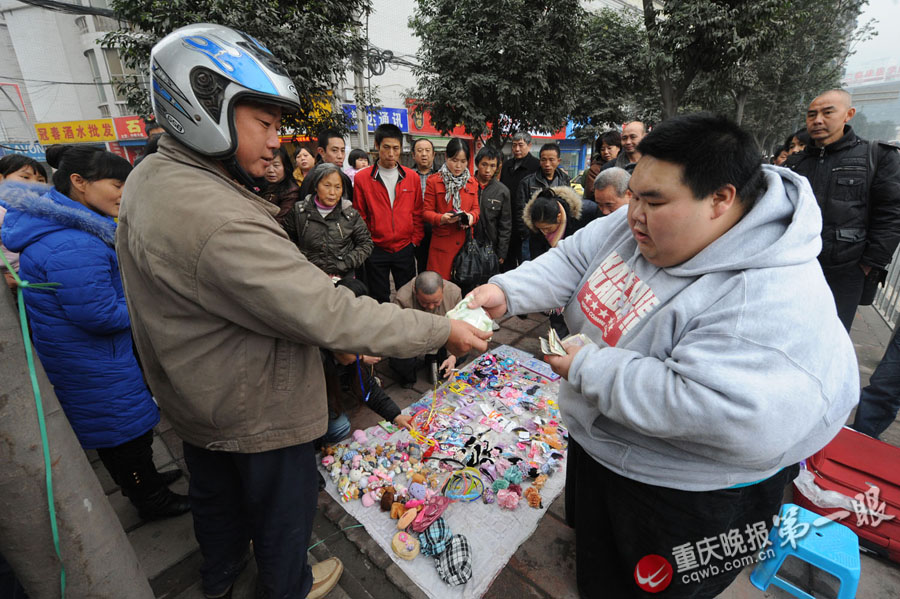 “走,出去擺哈地?cái),活?dòng)一下!”吃過午飯后,梁用打開病房的衣柜,提出一大包鑰匙鏈、手機(jī)鏈、耳環(huán)、頭花等小飾品。梁用的出現(xiàn),猶如明星一般,“看,又是哪個(gè)胖娃!”不少人圍了過來。記者守候了半個(gè)多小時(shí),發(fā)現(xiàn)大多顧客并非沖著飾品而來,而是被梁用巨大的體型吸引來的。