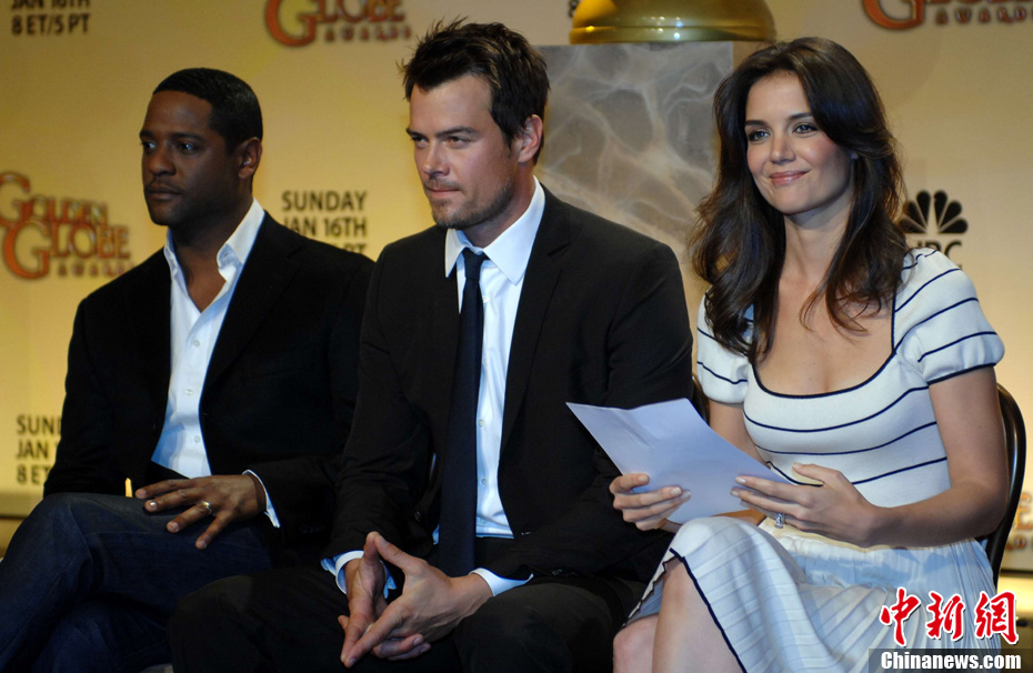 當(dāng)?shù)貢r間12月14日凌晨,第68屆美國金球獎提名名單揭曉!秶醯难菡f》、《社群網(wǎng)戰(zhàn)》和《斗士》領(lǐng)跑電影類獎項提名。圖為好萊塢明星、湯姆·克魯斯的妻子凱蒂·霍爾姆斯宣讀提名名單。中新社發(fā) 張煒 攝