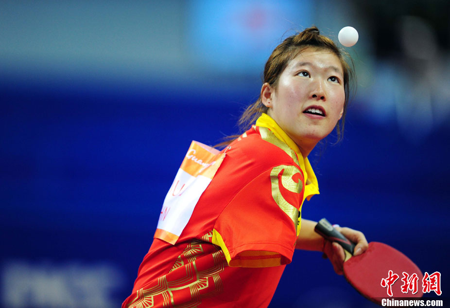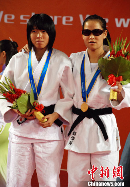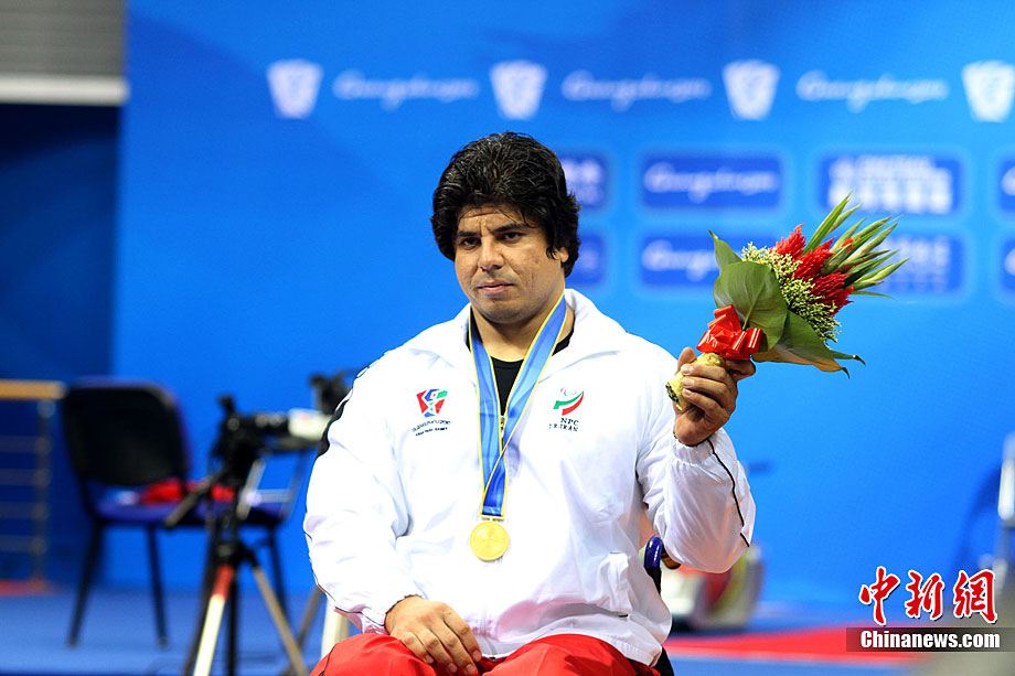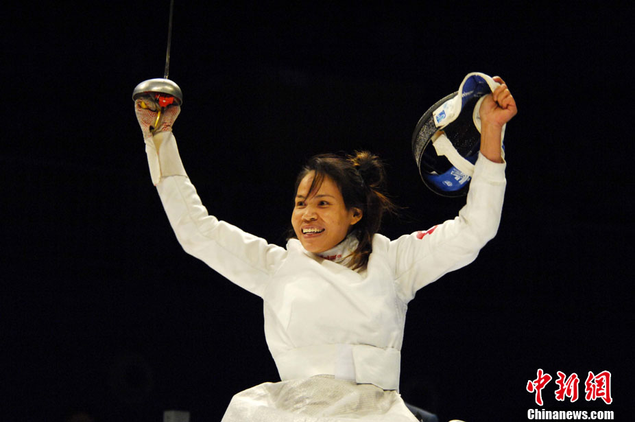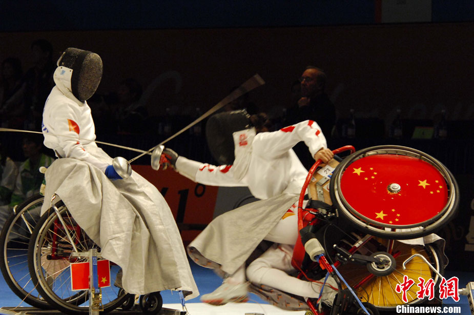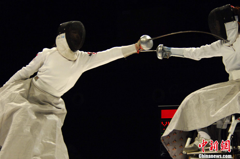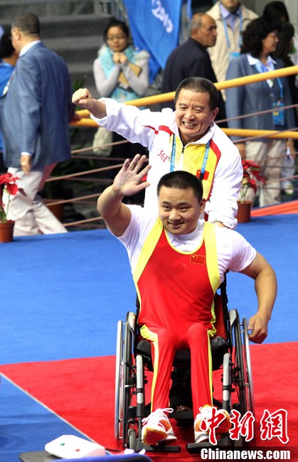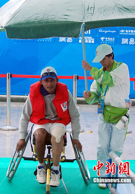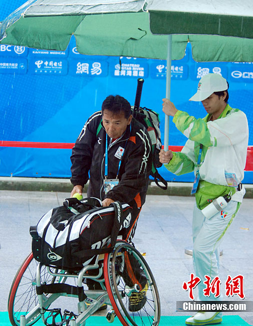 12月15日,志愿者雨天為運(yùn)動(dòng)員撐傘護(hù)航,無微不至。廣州2010亞殘運(yùn)會(huì),輪椅網(wǎng)球比賽在廣州天河體育中心網(wǎng)球?qū)W校舉行,因雨比賽從室外轉(zhuǎn)向室內(nèi)。尹雪峰 攝