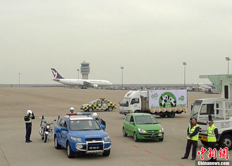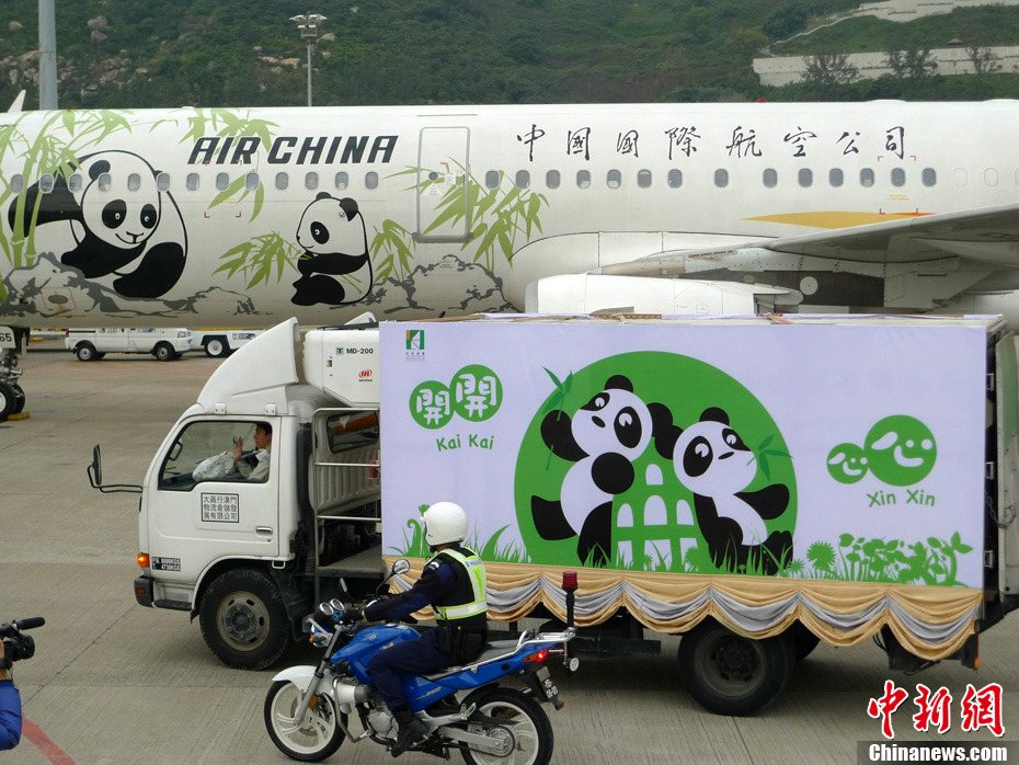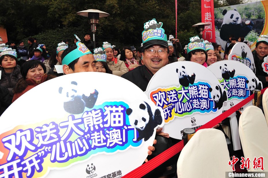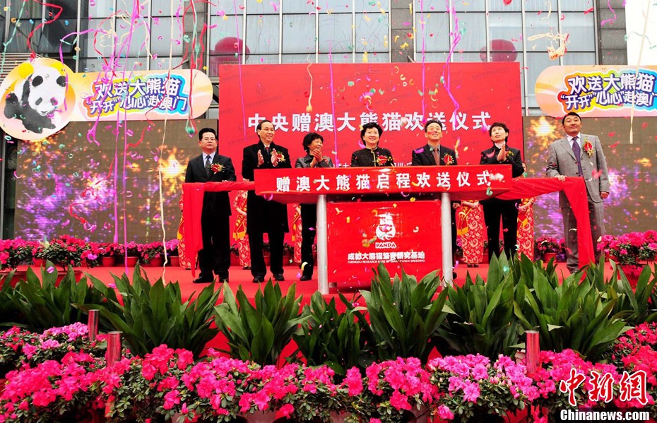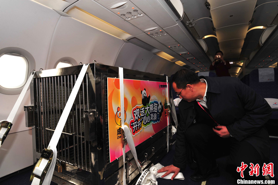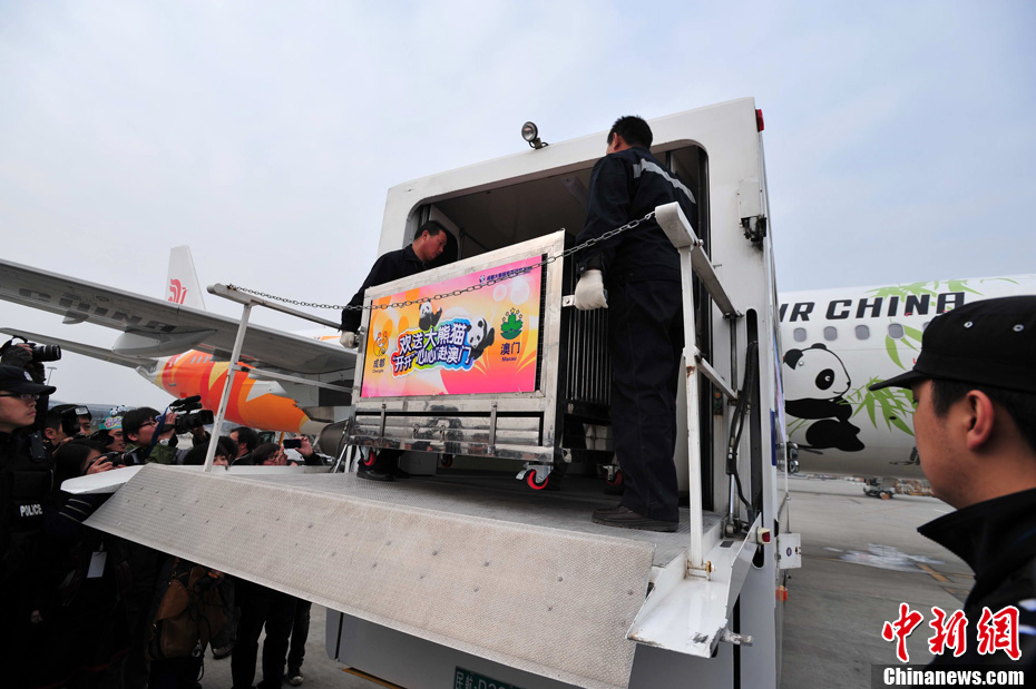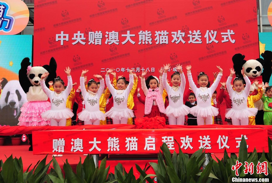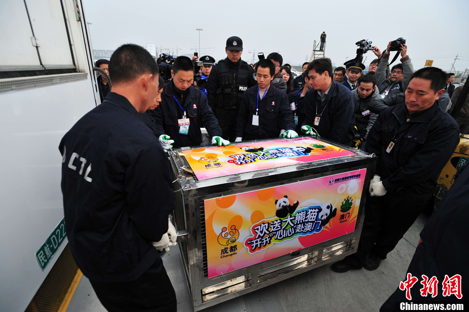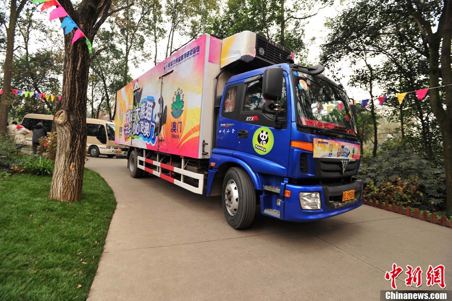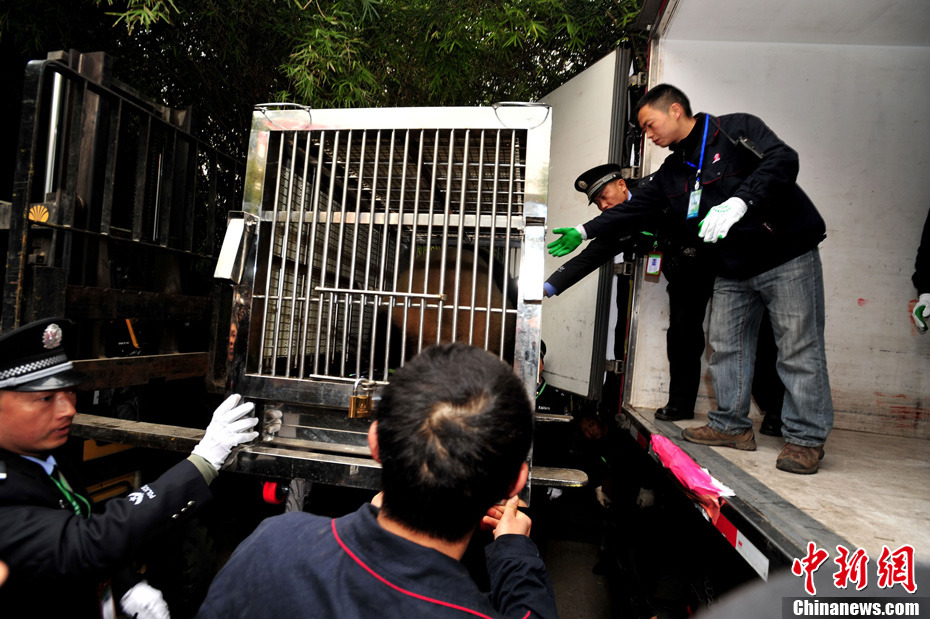 12月18日上午,中央贈澳大熊貓歡送儀式在成都大熊貓繁育研究基地的科學(xué)探秘館廣場舉行。儀式后,工作人員將裝運“開開”、“心心”的專用籠子搬上專車,開離成都大熊貓繁育研究基地,赴成都雙流國際機場。中新社發(fā) 安源 攝