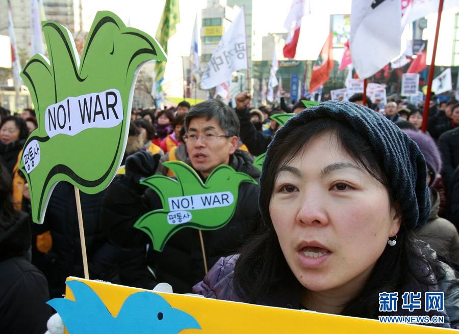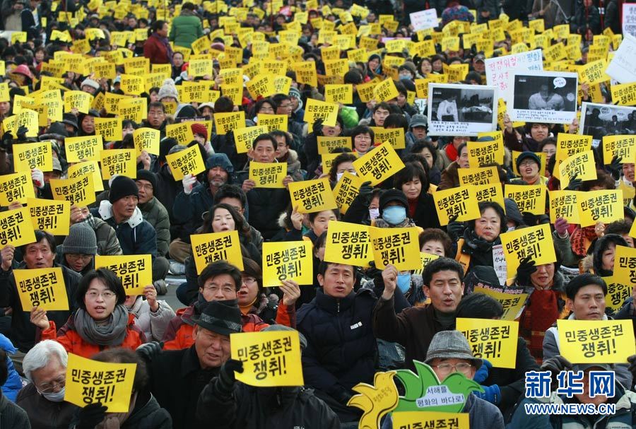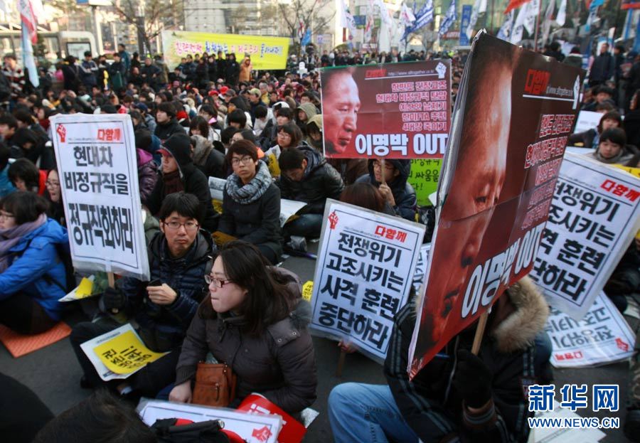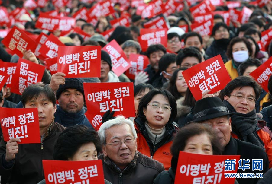 12月18日,在韓國首爾火車站,人們手舉標語,高喊口號,要求李明博政府下臺。當日,數千名韓國民眾在首爾舉行抗議,要求李明博政府下臺。韓國政府16日宣布將在18日至21日之間的某一天在延坪島海域舉行海上實彈射擊訓練。樸真熙攝 圖片來源:新華網