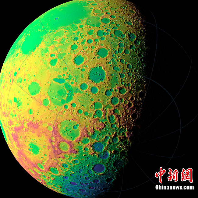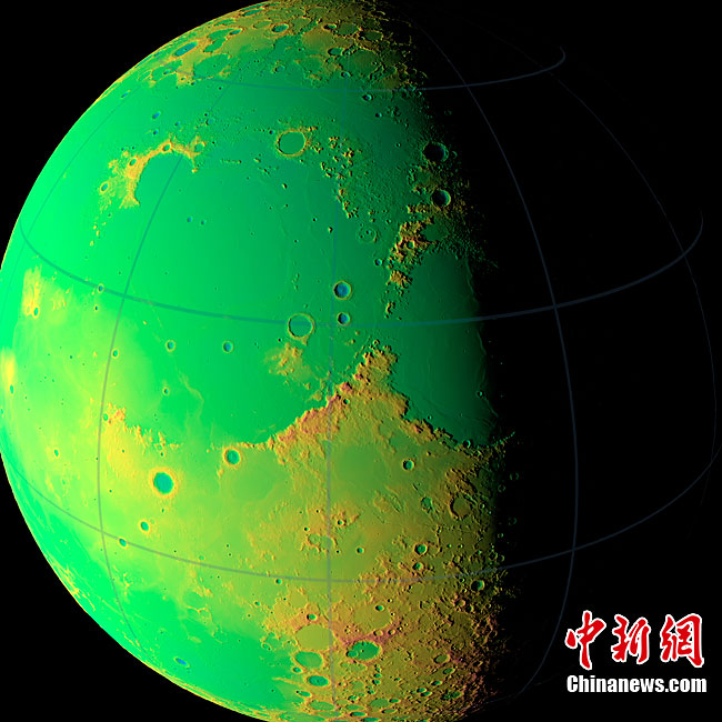 12月17日,美國航天局對外公布了月球勘測軌道飛行器攜帶的月球軌道飛行器激光測高儀(LOLA)對該地點進(jìn)行的高度測量?茖W(xué)家稱,月球勘測軌道飛行器使研究者能制造出最精確且最完整的月球地形圖。紅色代表月球最高點,藍(lán)色代表最低點。