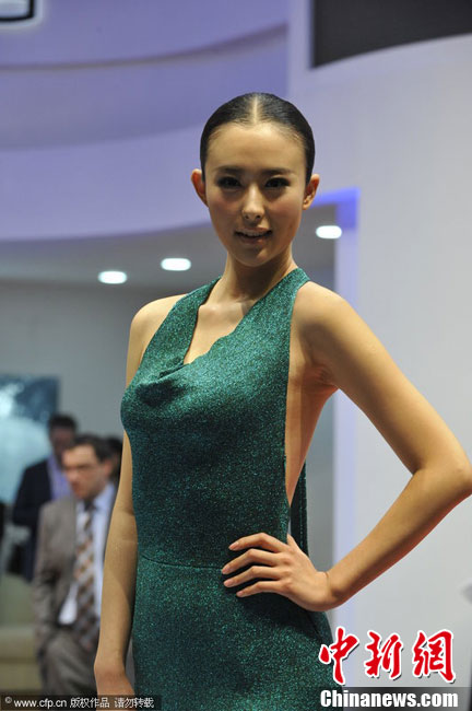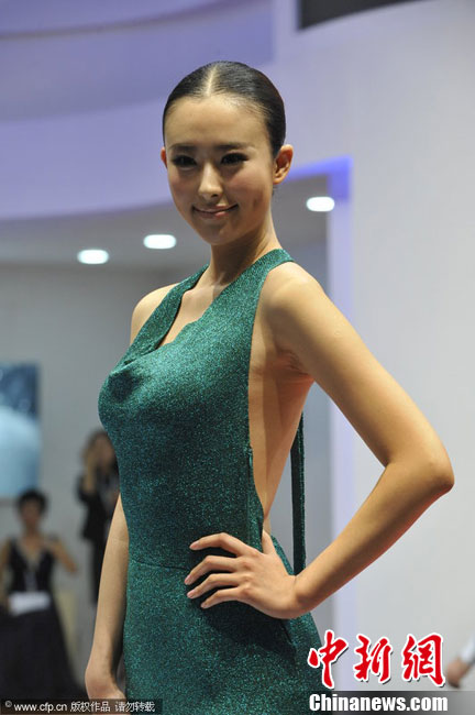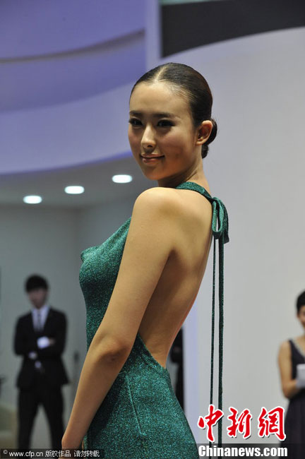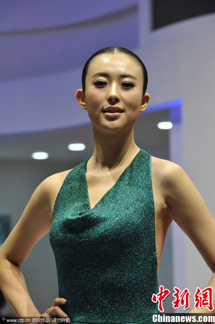 12月20日,2010廣州車展舉行,淡出車展許久的名模“獸獸”翟凌助陣西班牙超級(jí)跑車展臺(tái)。一襲露背綠裙的她驚艷全場(chǎng)。江心 攝 圖片來源:CFP視覺中國(guó)