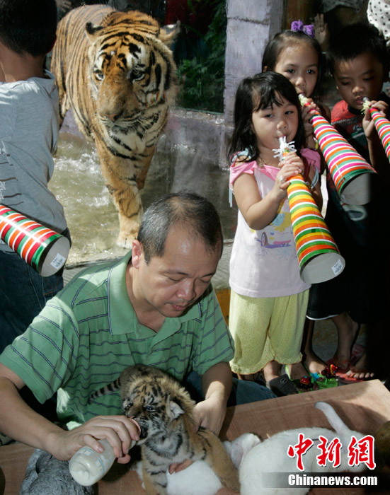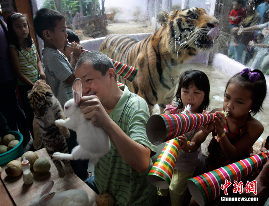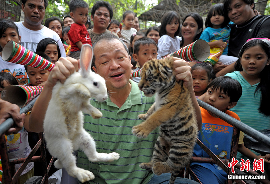 12月28日,菲律賓首都馬尼拉北部的馬拉邦動物園,一名工作人員抓起老虎幼崽和兔子向游客展示。許多亞洲國家都有慶祝農(nóng)歷新年的習(xí)俗,人們即將告別虎年,迎來兔年。