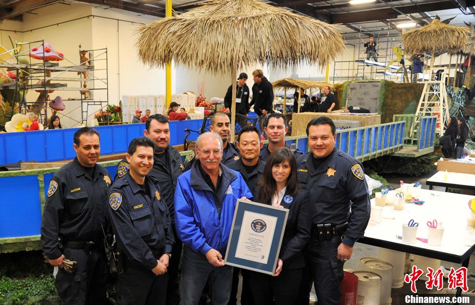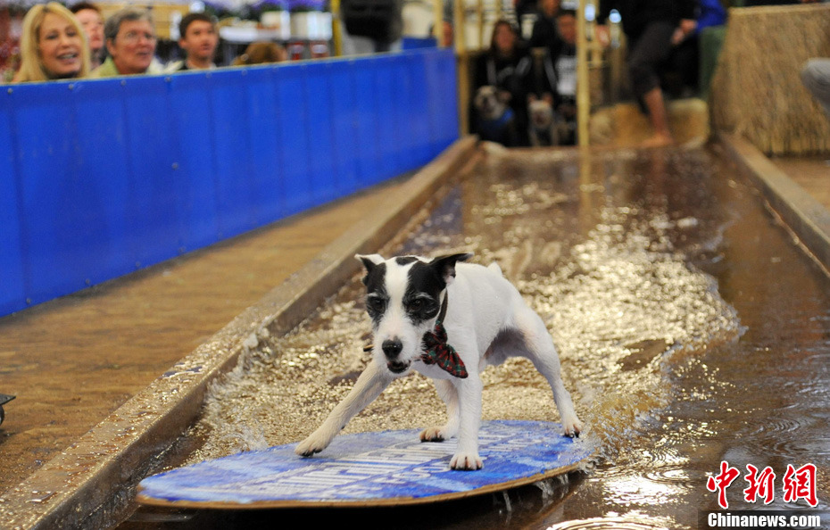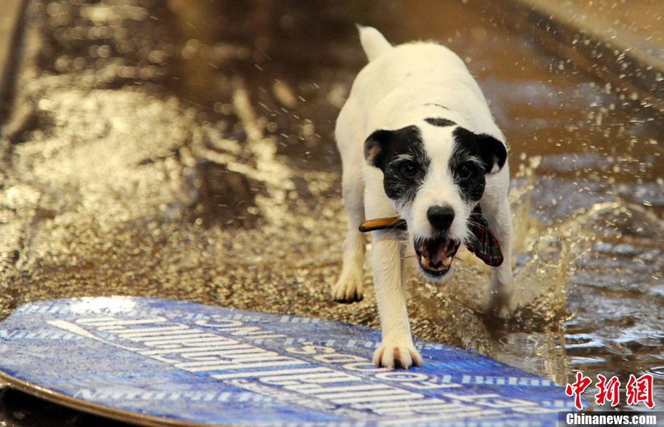 美國(guó)一家寵物食品公司推出的新年花車12月29日獲得吉尼斯認(rèn)證,成為世界上最重的單體花車;ㄜ嚳傊剡_(dá)到35噸,其中包括約15噸水。這輛花車將參加2011年元旦舉行的第122屆美國(guó)玫瑰花車大游行,屆時(shí)十只寵物狗將在花車上表演沖浪、跳水等高難度動(dòng)作。圖為寵物狗沖浪彩排。中新社發(fā) 張煒 攝