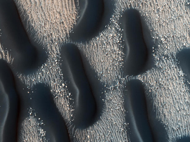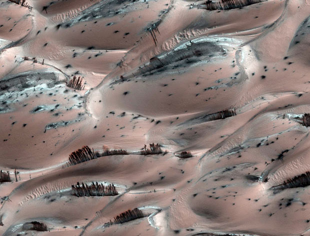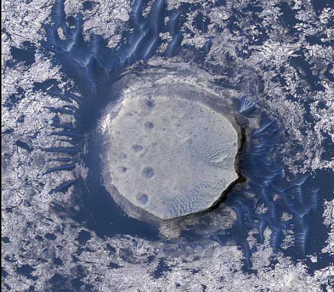 美國宇航局“火星偵察軌道器”在火星“阿拉比亞陸地平原”地區(qū),拍攝到的奇怪隕石彈坑。自從2006年以來,“火星偵察軌道器”已經(jīng)發(fā)回100兆兆位的信息,相當(dāng)于MP3中存了300萬首歌。