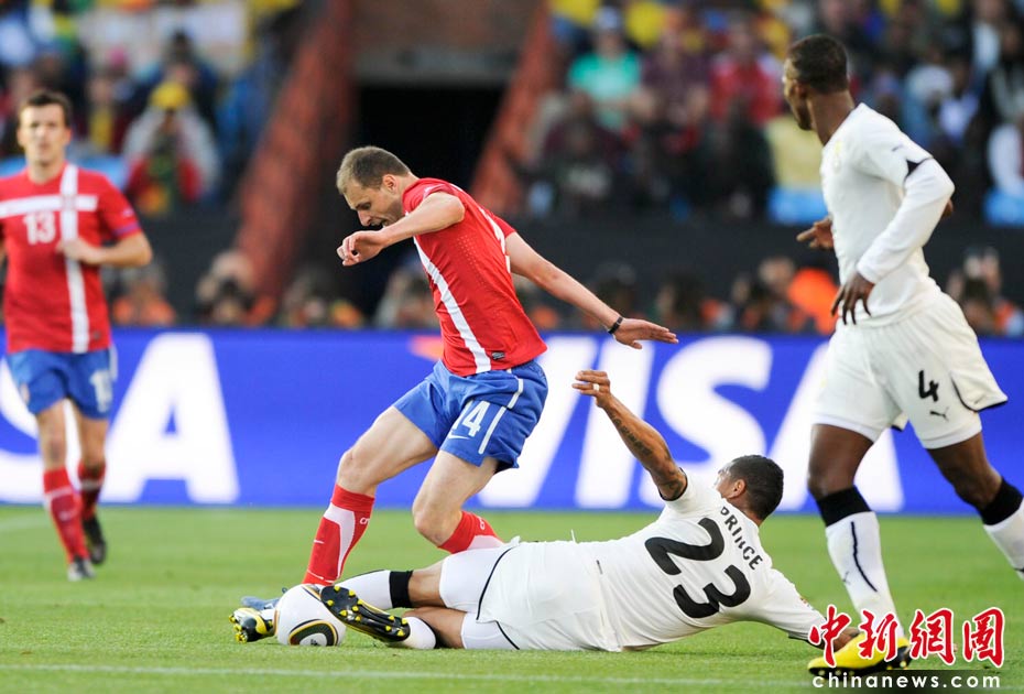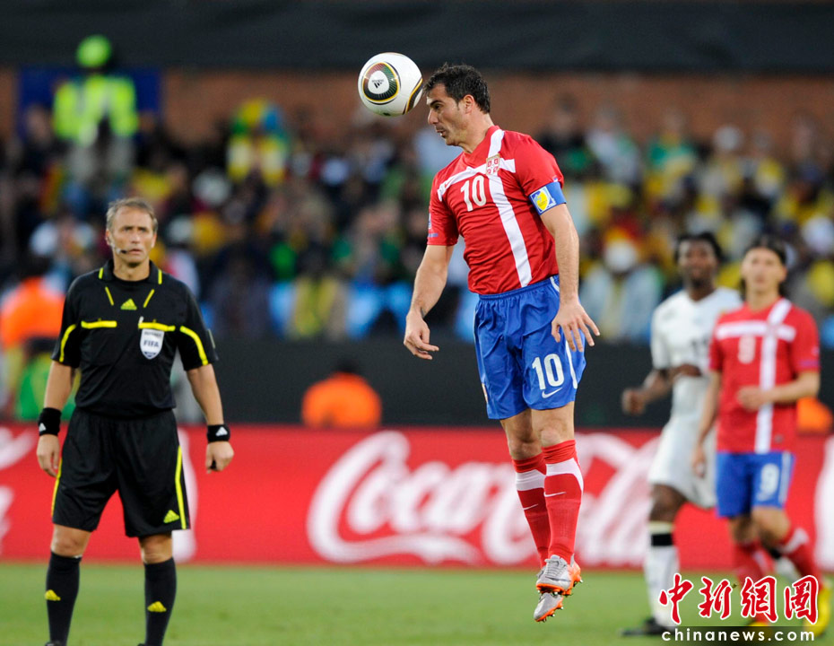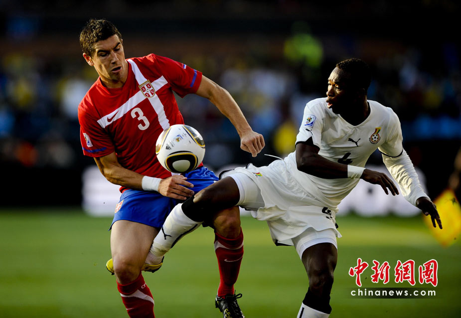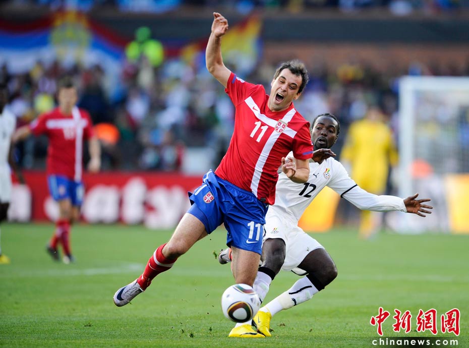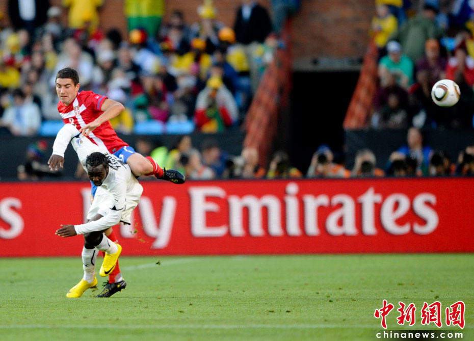 6月13日,南非世界杯D組小組賽在比勒陀利亞洛夫托斯球場舉行,在上半場比賽中塞爾維亞與加納隊(duì)展開激烈爭奪。