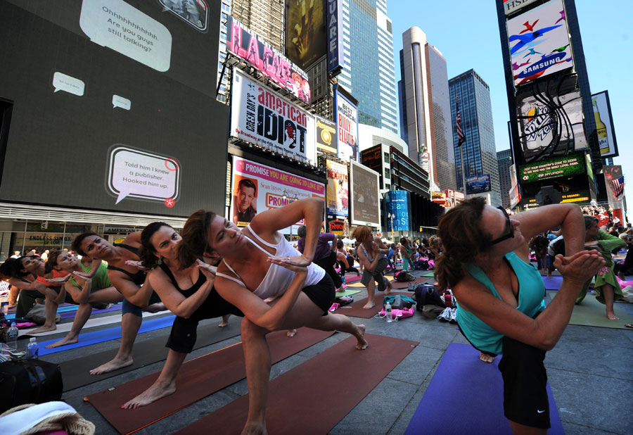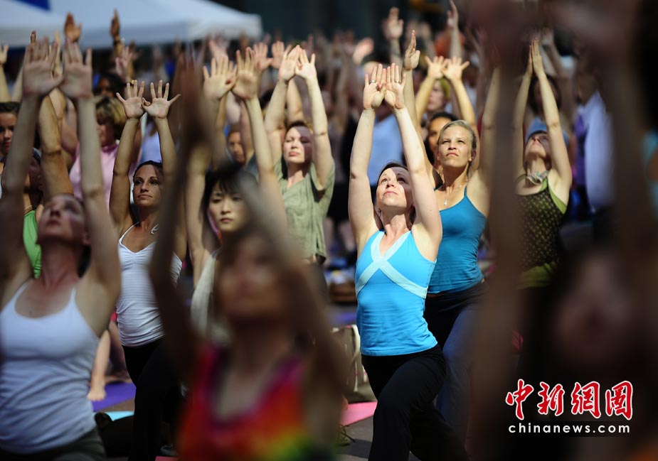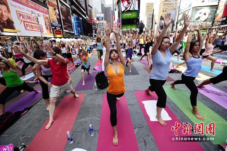 6月21日,數(shù)千瑜伽愛好者在美國紐約時報廣場用集體瑜伽的方式迎接夏至的到來。
