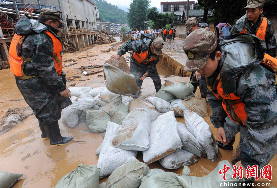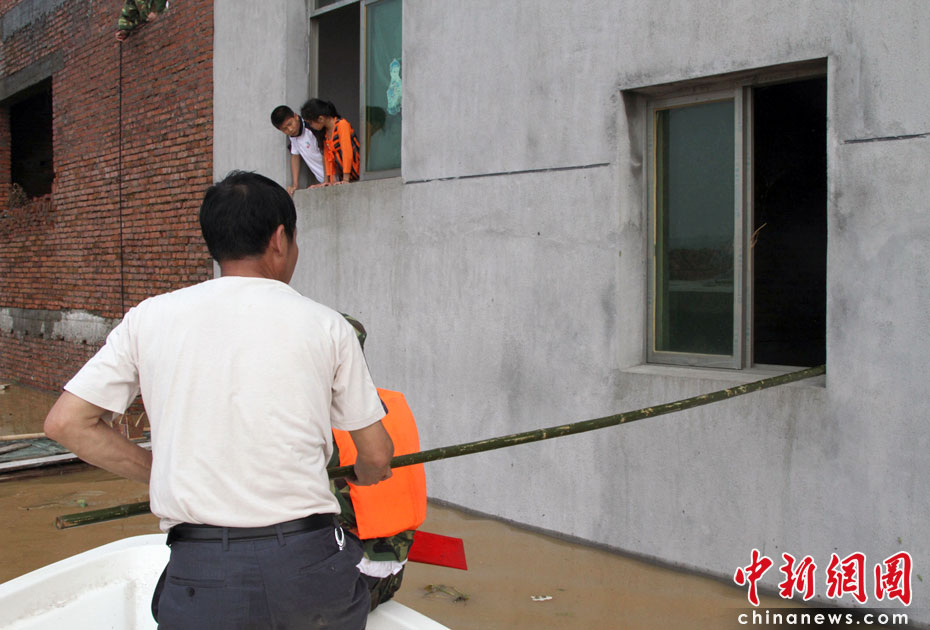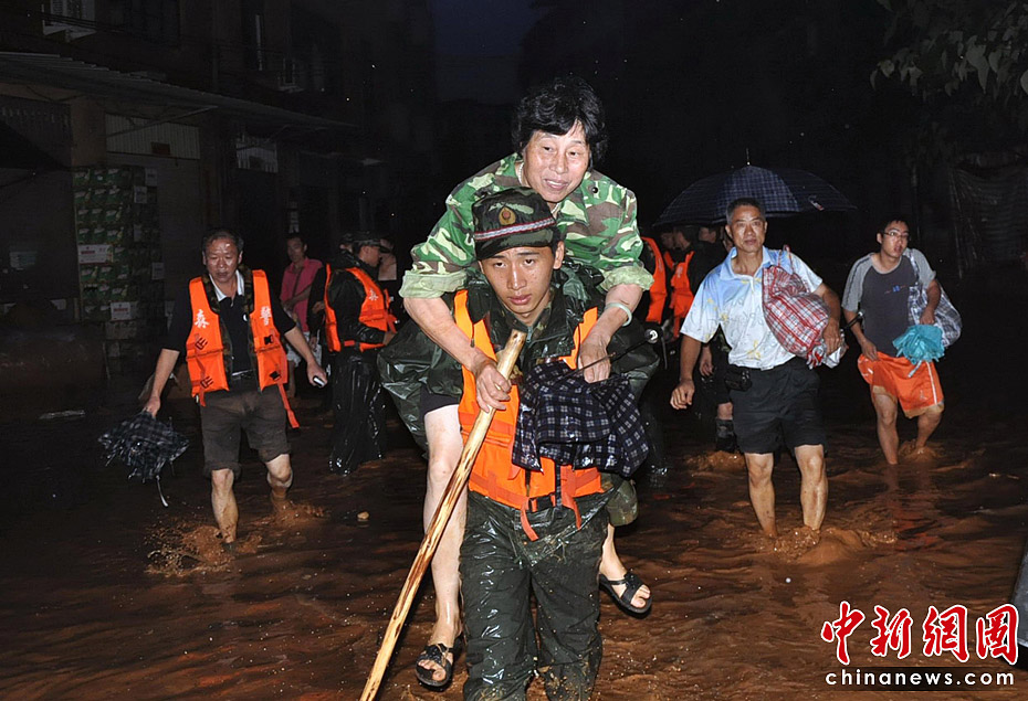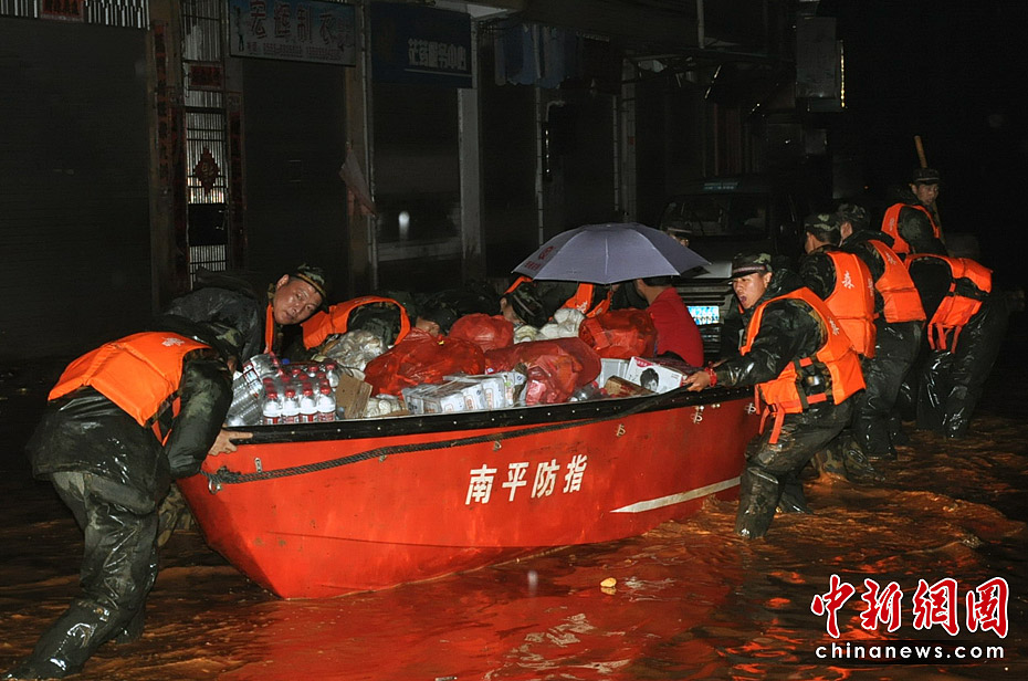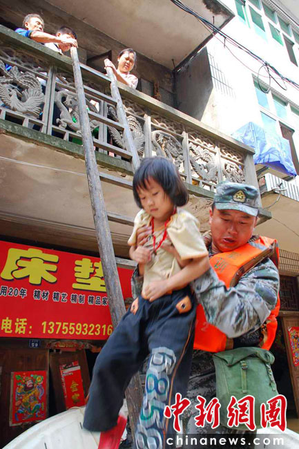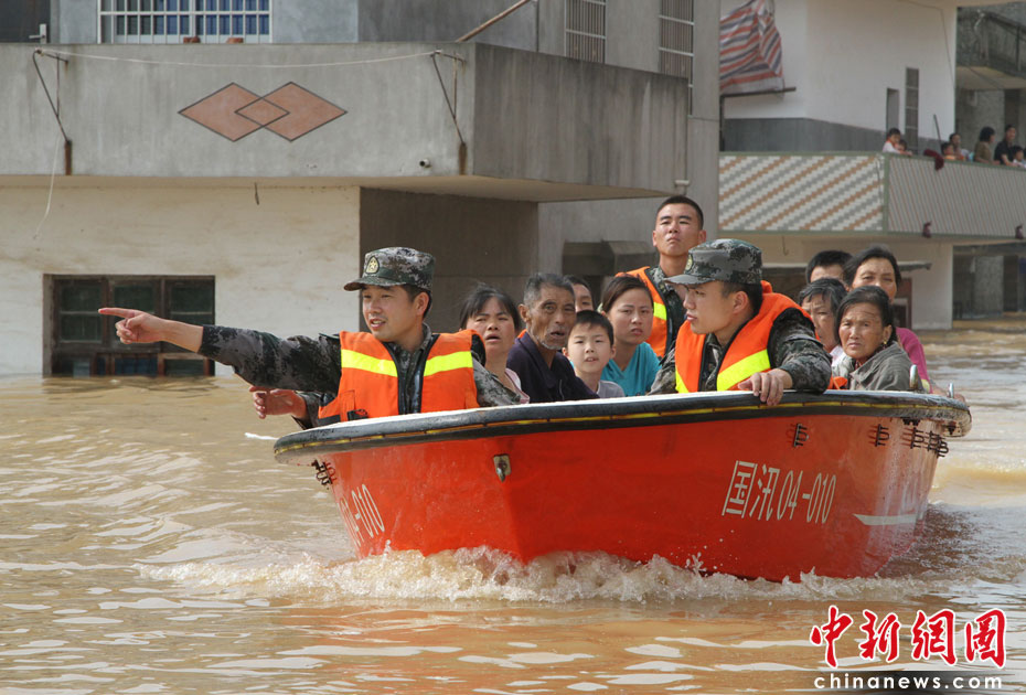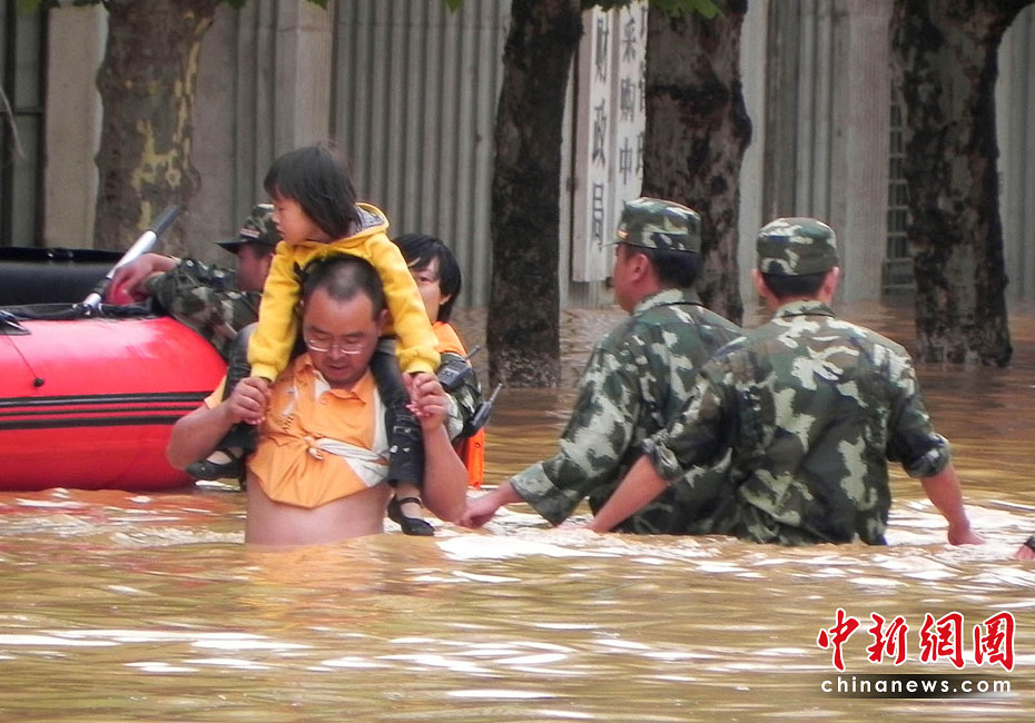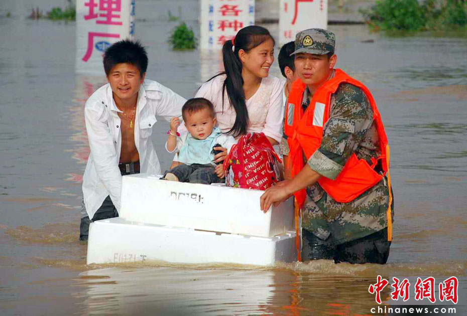 江西第二大河流撫河干流發(fā)生超歷史洪水,撫河唱凱堤21日傍晚決口,嚴重威脅下游5個鄉(xiāng)鎮(zhèn)14.5萬人口的安全。南京軍區(qū)戰(zhàn)士和群眾一起解救被洪水圍困的婦女和小孩,泡沫箱成了“生命小舟”。何柳斌 攝