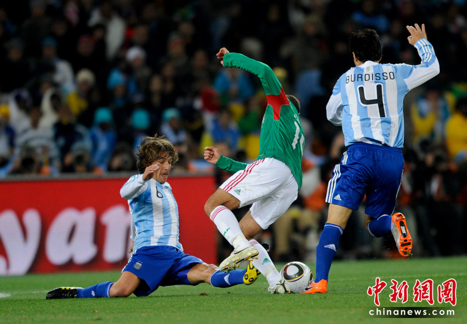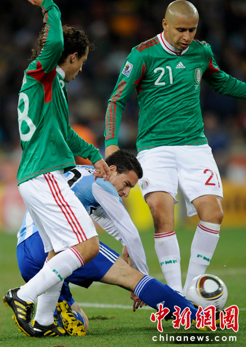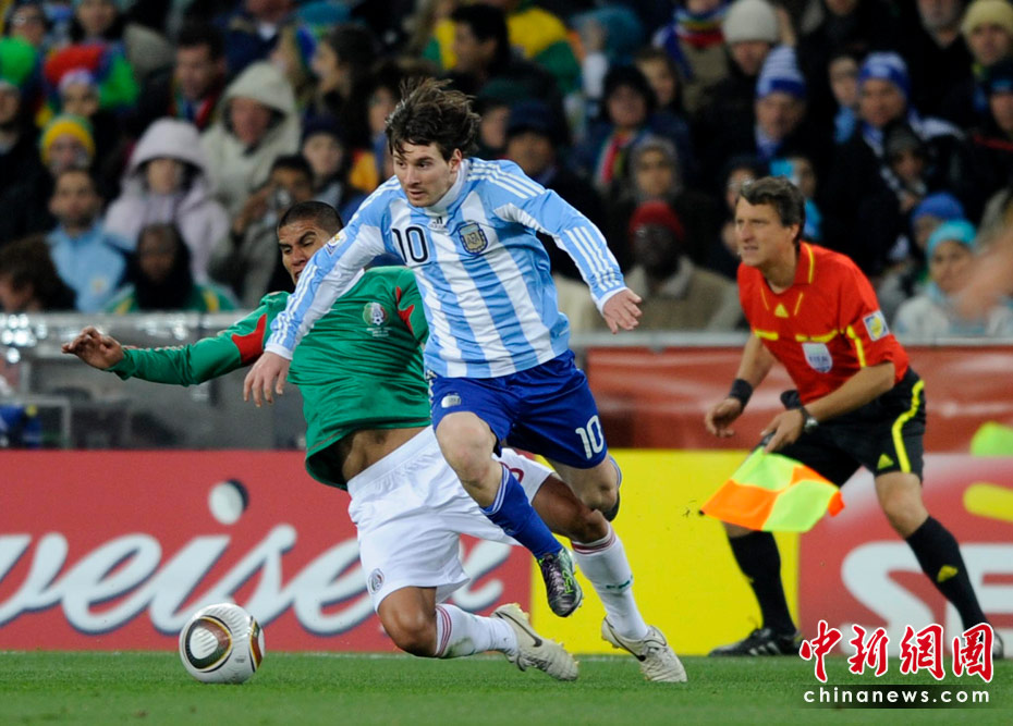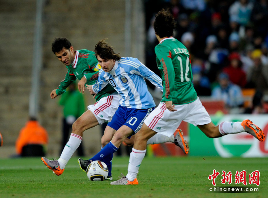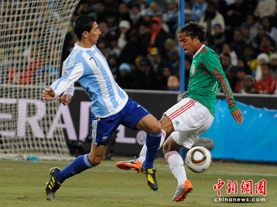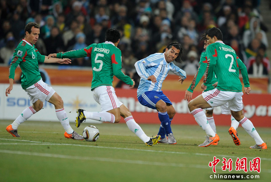 北京時間6月28日凌晨2:30,南非世界杯1/8決賽再賽一場,阿根廷隊(duì)在約翰內(nèi)斯堡的足球城球場迎來了墨西哥隊(duì)。憑借特維斯一個明顯越位進(jìn)球首開紀(jì)錄,隨后伊瓜因和特維斯各進(jìn)一球,以3-1擊敗墨西哥,晉級八強(qiáng)。 中新社記者 廖攀 攝